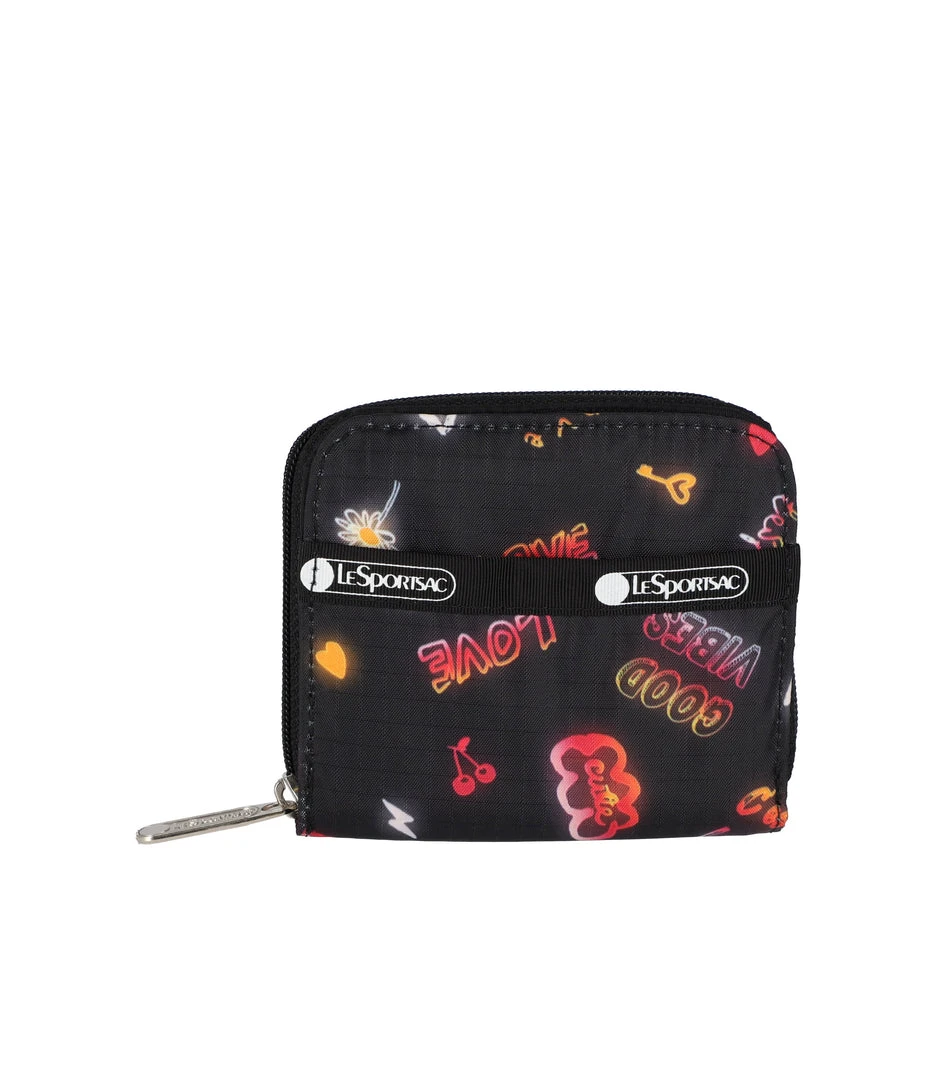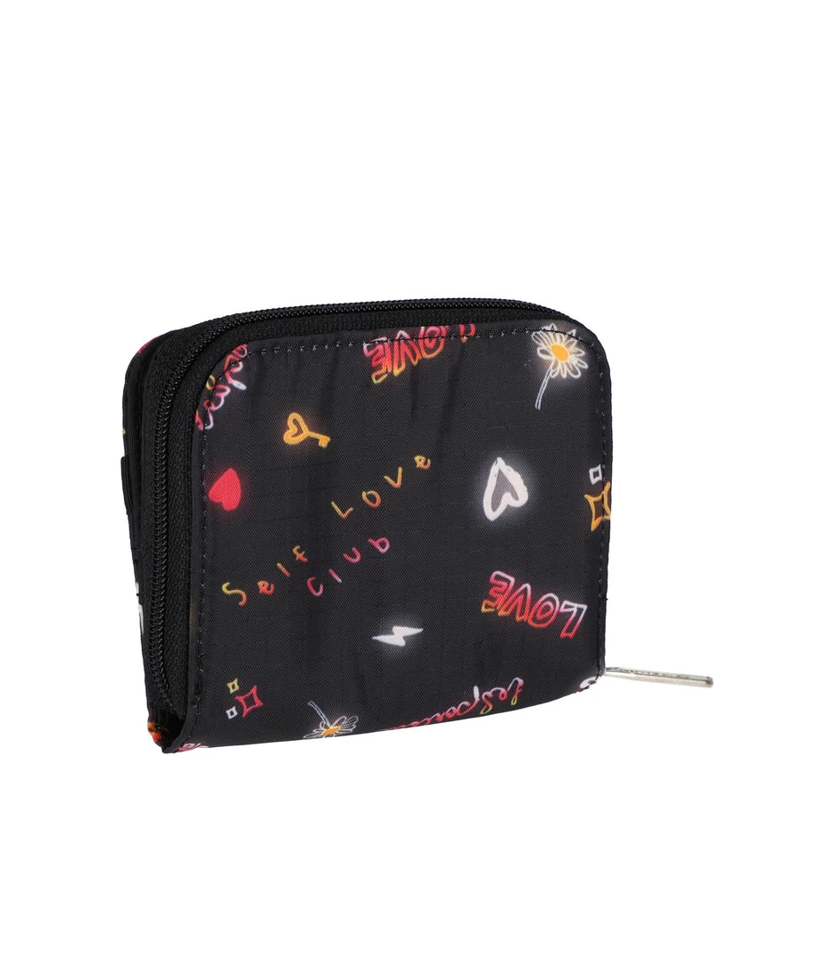 Full-length bill compartment with snap closure, Zip closure coin compartment, Exterior open pocket, 8 interior credit card slots