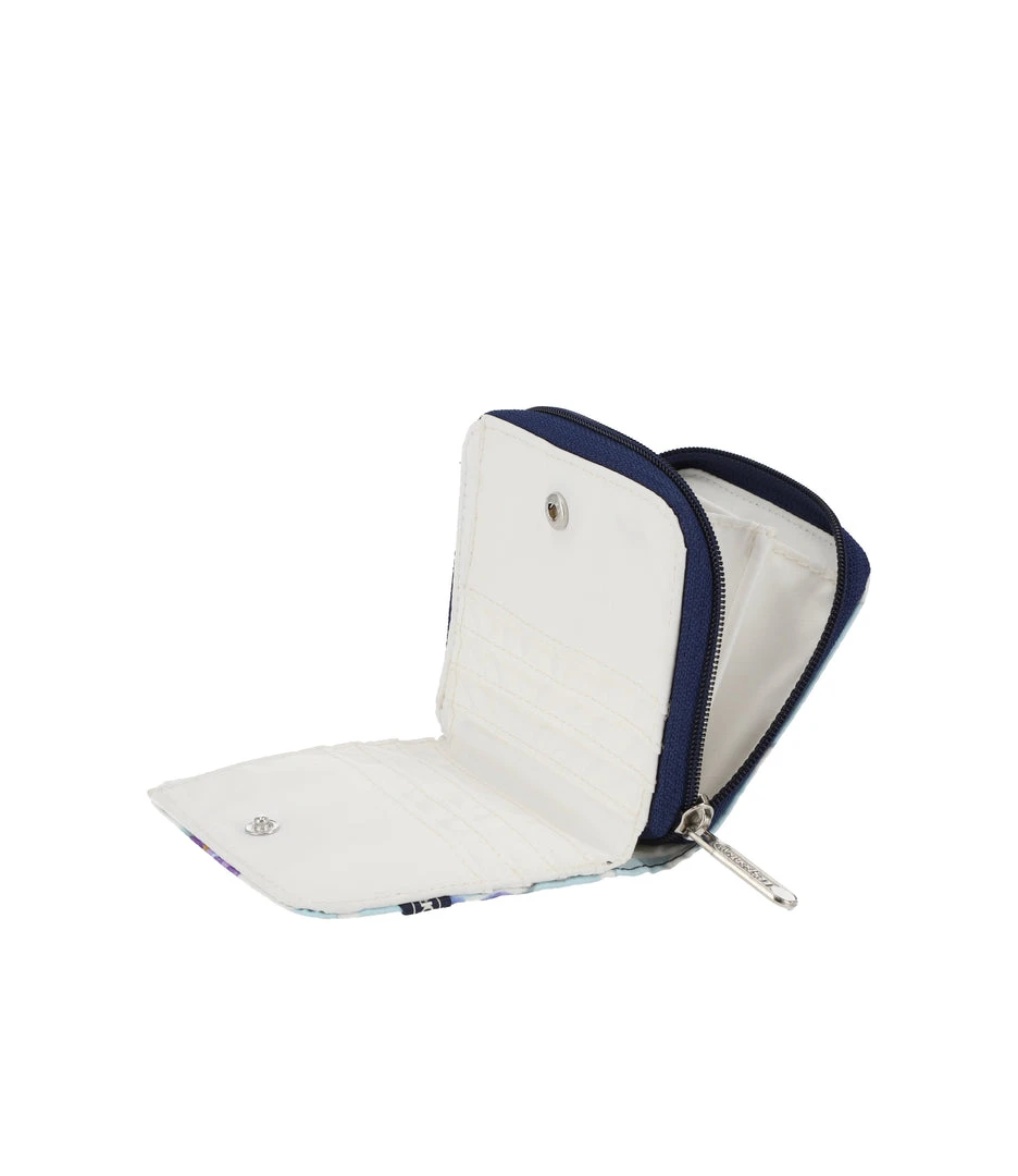Full-length bill compartment with snap closure, Zip closure coin compartment, Exterior open pocket, 8 interior credit card slots