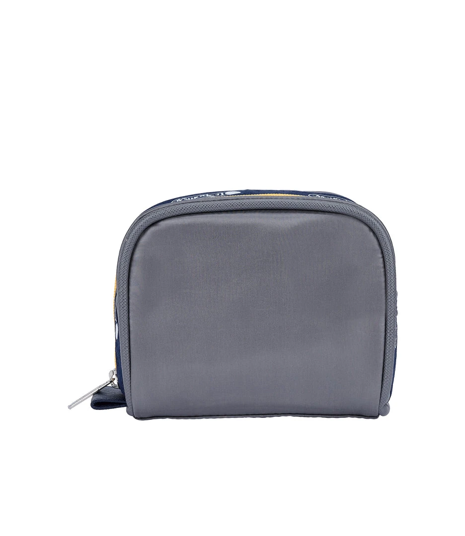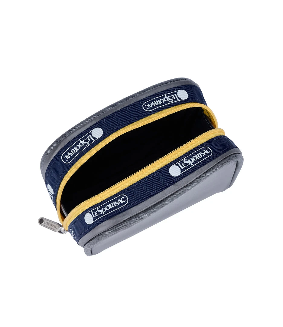 Zipped main closure, Inside gusset for easy opening, Metal hardware, Vegan-leather trim details, Piped edges for added structure