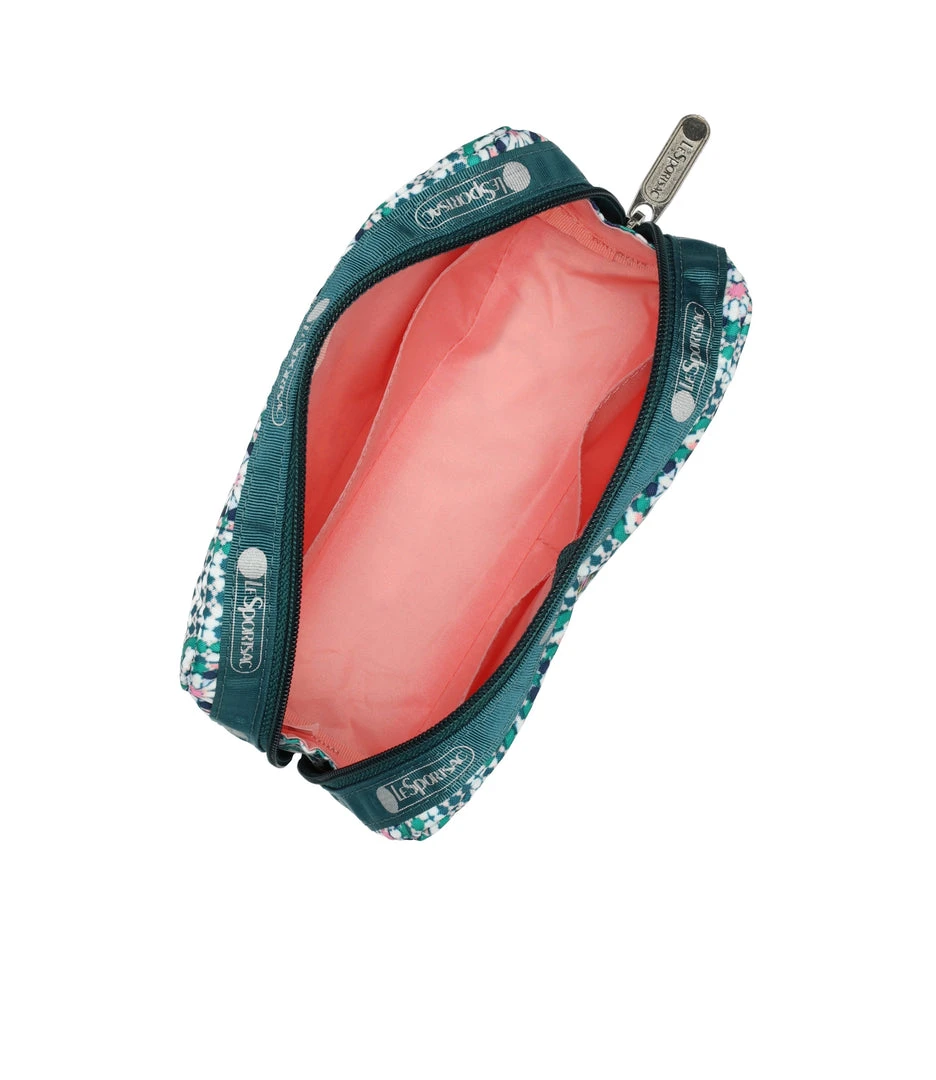 Zipped main closure, Interior back wall open pocket, Two interior front wall open pockets