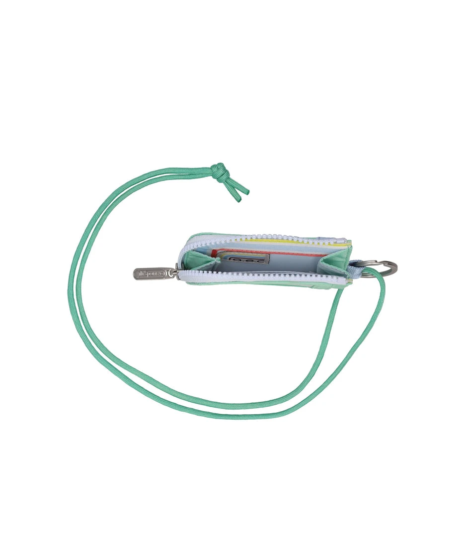 Zip around main closure, Metal key ring with lanyard cord (Drop: 19.96 inch/50cm), Exterior front open pocket, Exterior back clear ID window pocket, Interior back wall features two card pockets