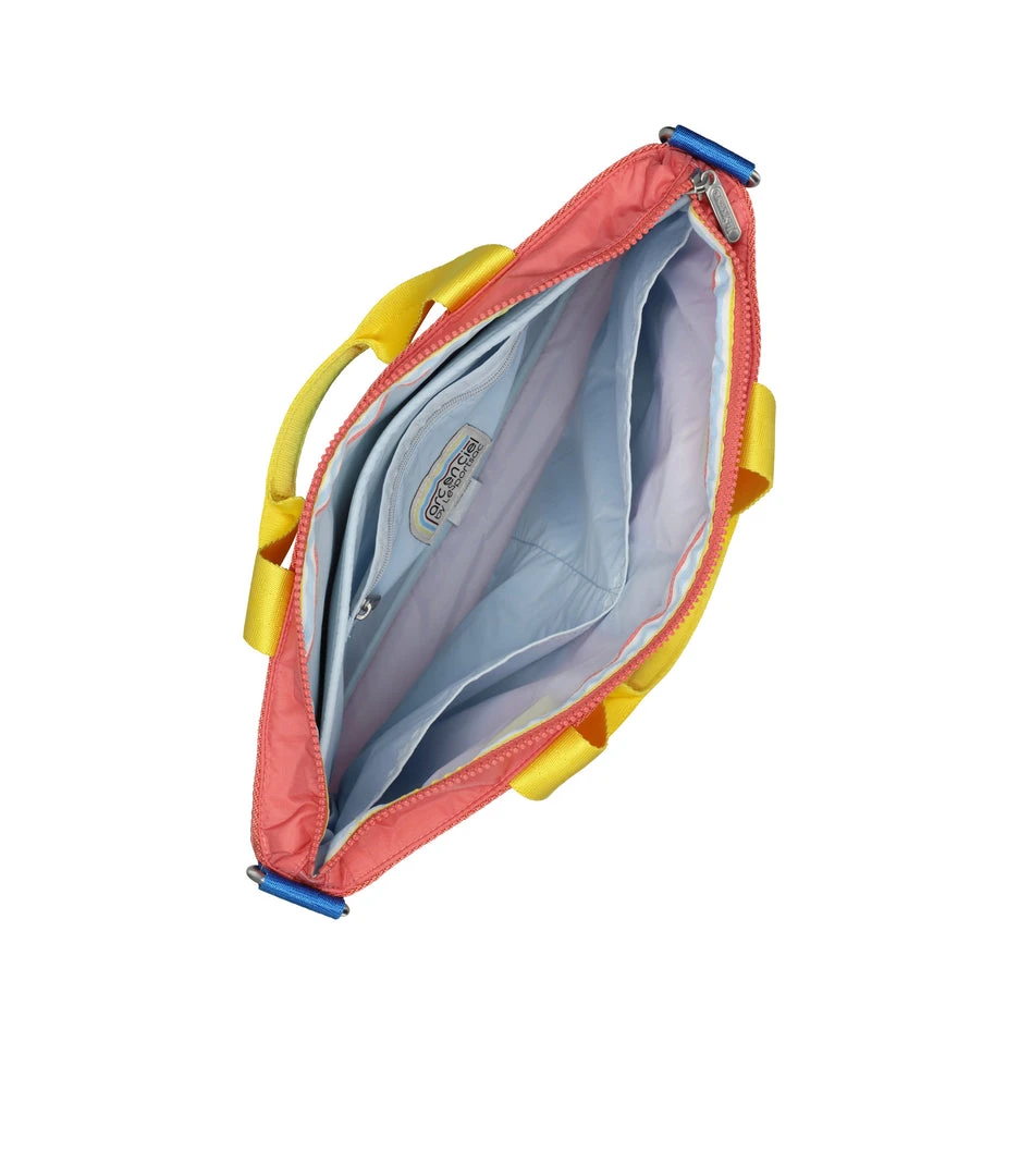 Zip top main closure, Exterior front pocket with zip closure, Exterior back open pocket, Interior back wall features a padded laptop pocket (fits most 15 inch laptops) and a combination zip/open pocket, Two interior front wall open pockets, 1.5 in/3.8cm wide pinched top handles (Drop: 4 in/10cm, Length:13 in/33cm), 1.5in/3.8cm wide adjustable/ detachable shoulder strap with logo grosgrain details (Max length: 50 in/127 cm, Min length: 28.54 in/72.5 cm)