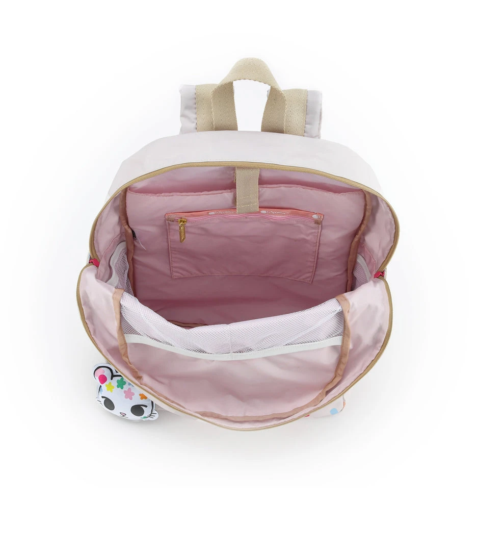 Zip main closure with dual zipper pulls, Exterior front pocket with zip closure, Two side exterior open top pockets with elastic expansions, Exterior back panel features an open top pocket with bottom zipper (that when unzipped creates a luggage sleeve to slide over rolling suitcase handles), Top handle loop (1in/3.81 cm wide webbing), Adjustable padded shoulder straps with plastic hardware (maximum strap extension of 32.1in/81.5cm), Two interior front wall open mesh pockets with elastic at the top, Two interior side wall open mesh pockets with elastic tops (for water bottles), Interior back wall padded laptop pocket with Velcro tab closure (fits 13inch laptops), Interior back wall combination zip/open pocket, Includes a detachable woven plush Palette head charm on 1in (2.5cm) long gold-tone metal chain with ring clip