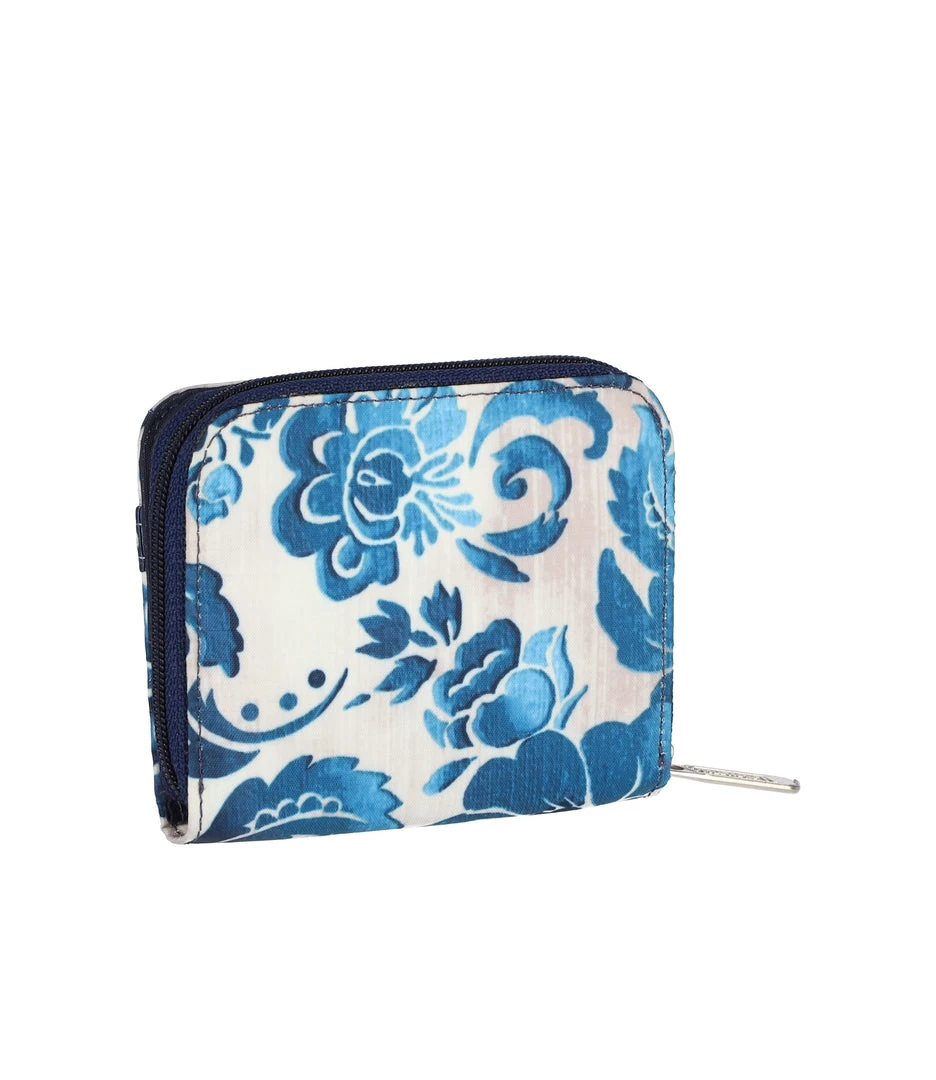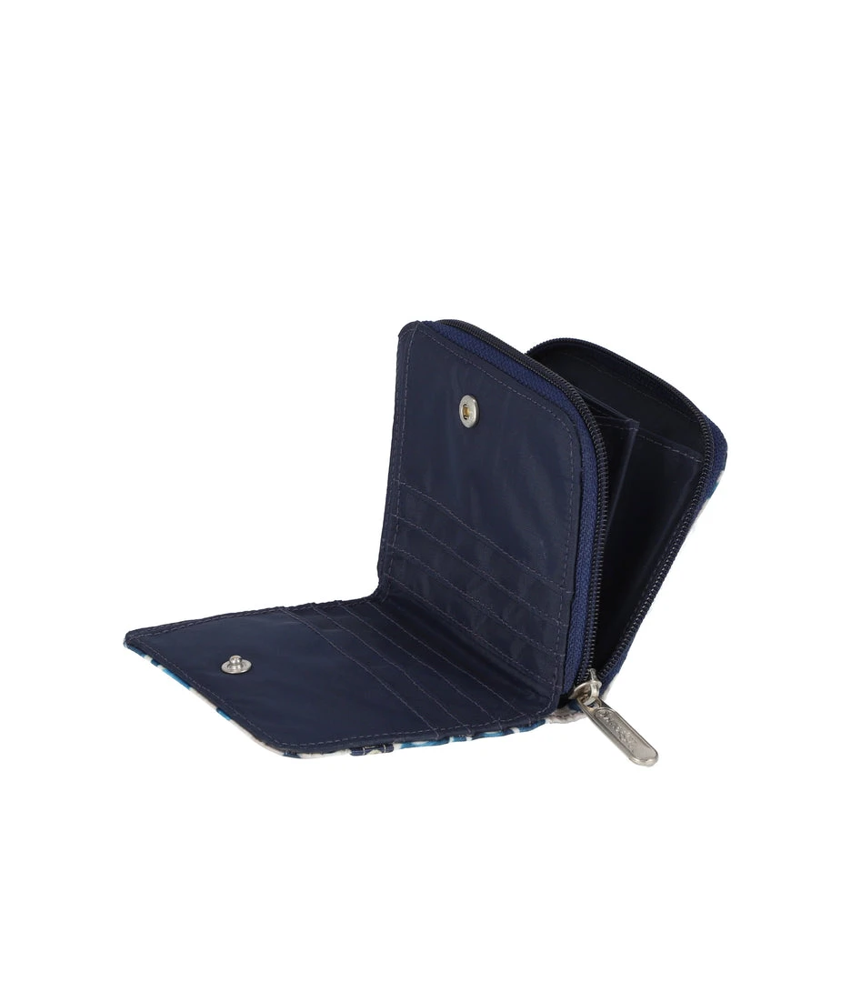 Full-length bill compartment with snap closure, Zip closure coin compartment, Exterior open pocket, 8 interior credit card slots