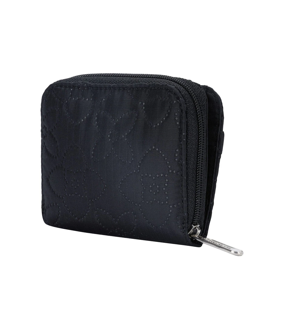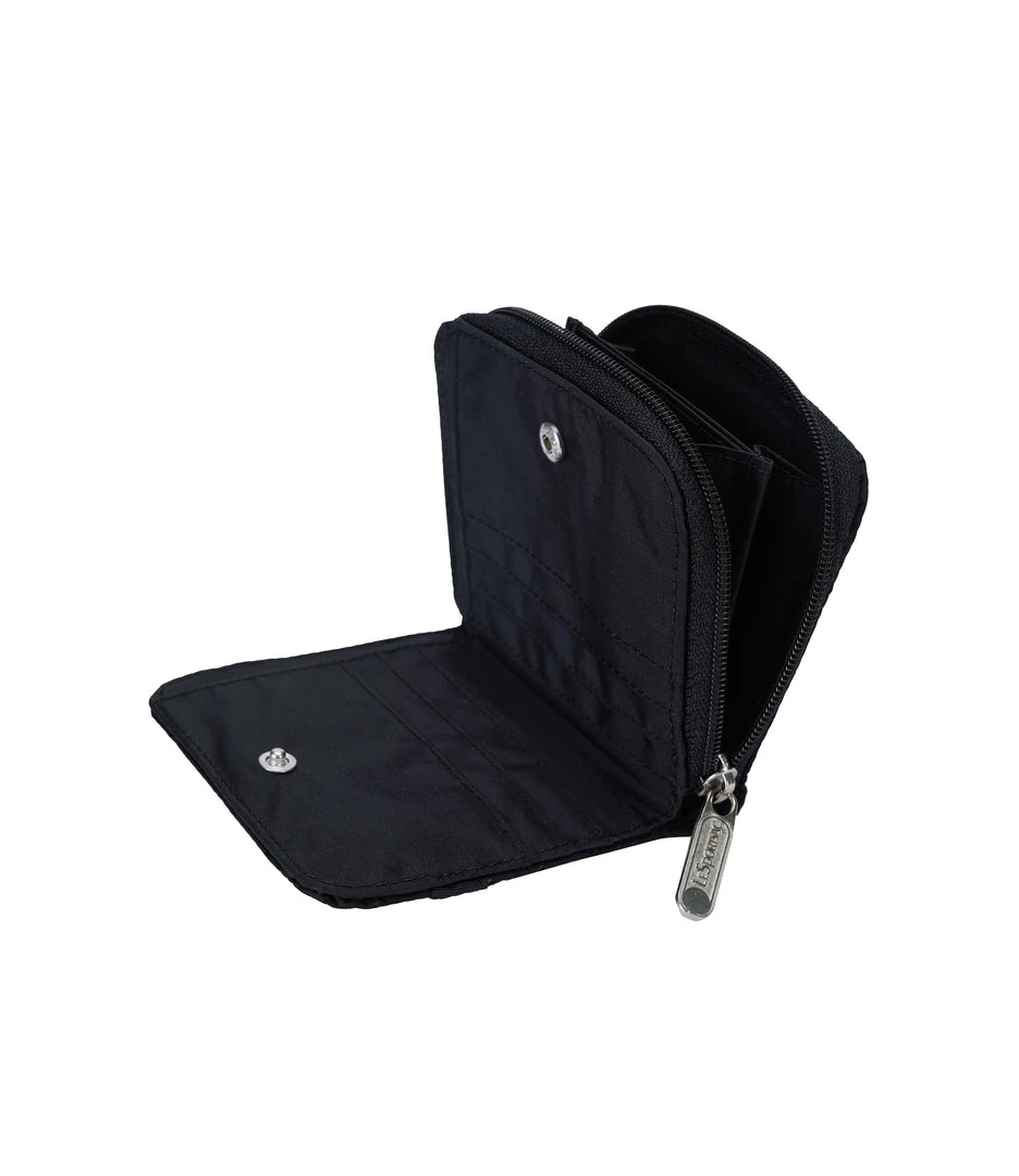 Full-length bill compartment with snap closure, Zip closure coin compartment, Exterior open pocket, 8 interior credit card slots