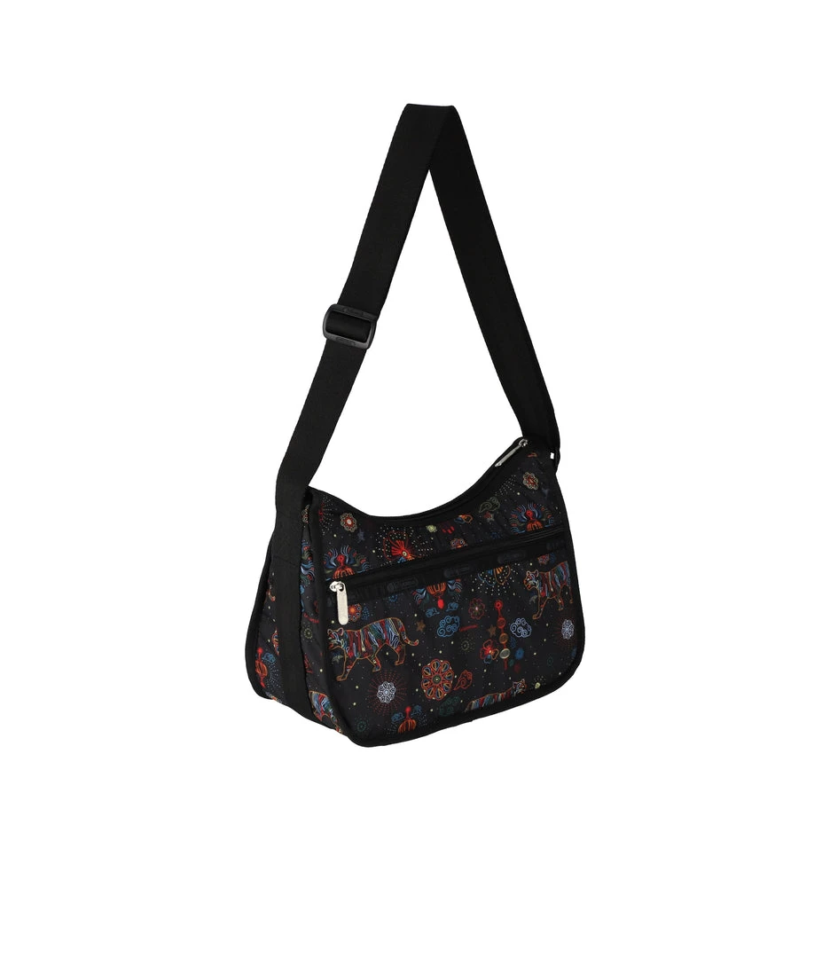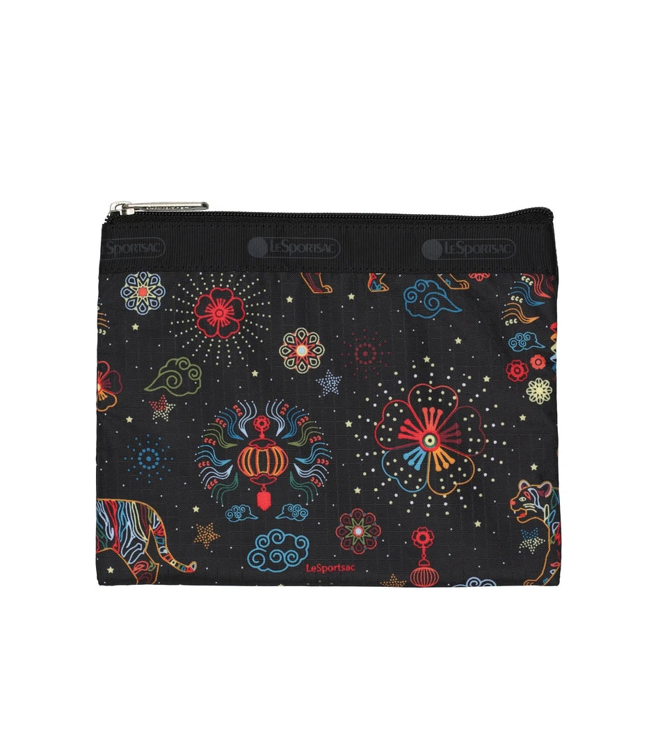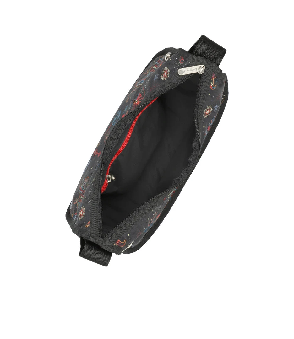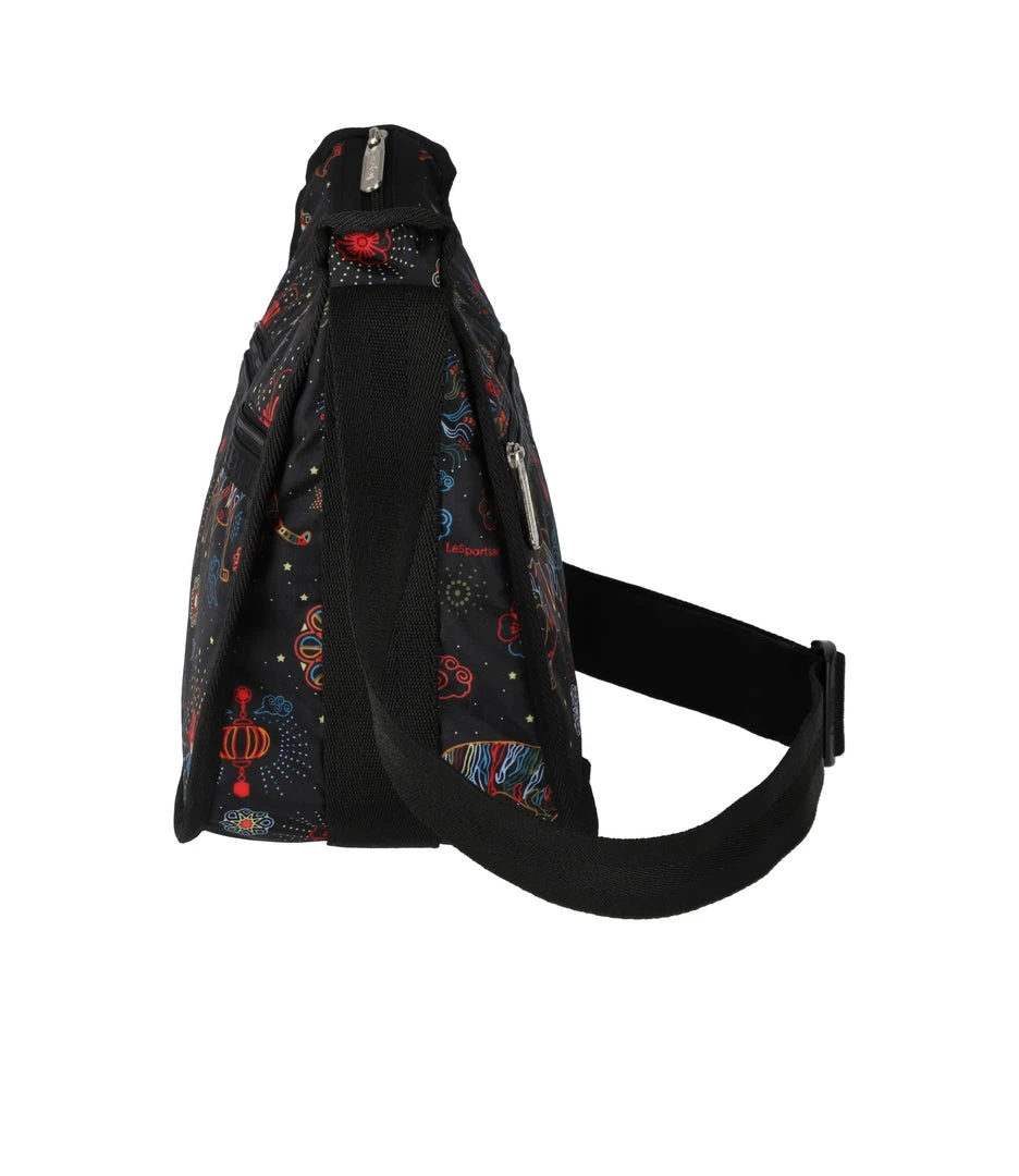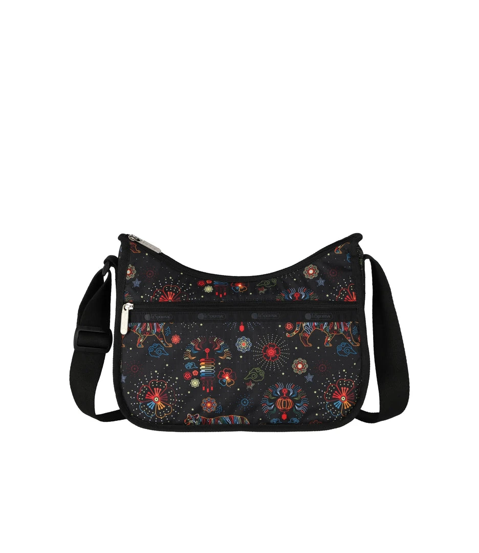 Zipped main closure, Exterior front pocket with zipped closure, Exterior back pocket with zipped closure, Interior back wall hanging zipper pocket, Adjustable shoulder strap (Max. 50in / 127cm), Includes matching pouch with zipped closure