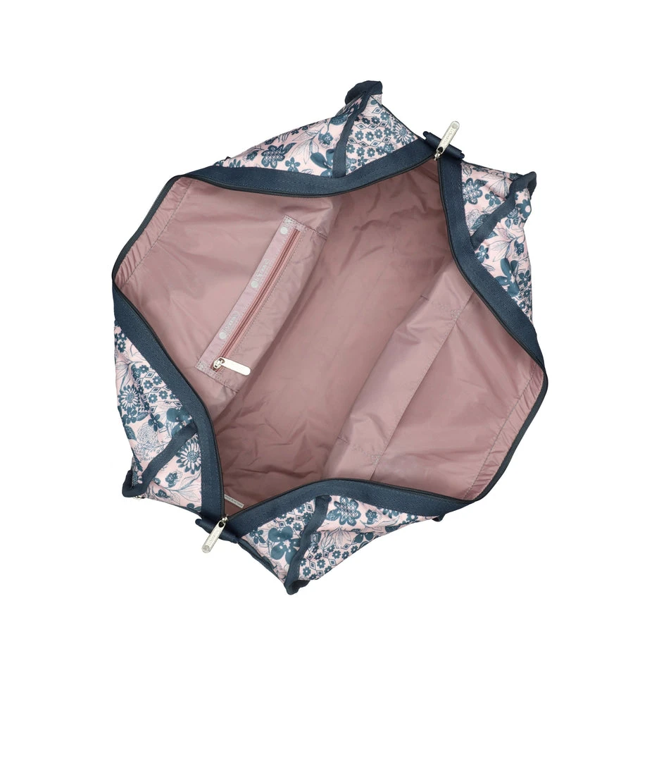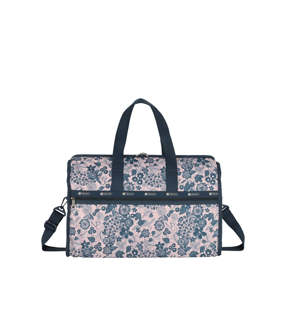Zip main closure with dual zipper pulls, 8.5in (21.59cm) Top handle drop, 1.5in (3.81cm) Wide adjustable/detachable crossbody strap (Max. 42in/106.68cm), Exterior front panel zipper pocket, Exterior back panel zip closure pocket with dual zipper pulls and a bottom zipper to convert pocket into a sleeve (to slide over rolling luggage handles), Two exterior side pockets with zip closures, Three interior front wall open pockets, Interior back wall combination zip/open pocket