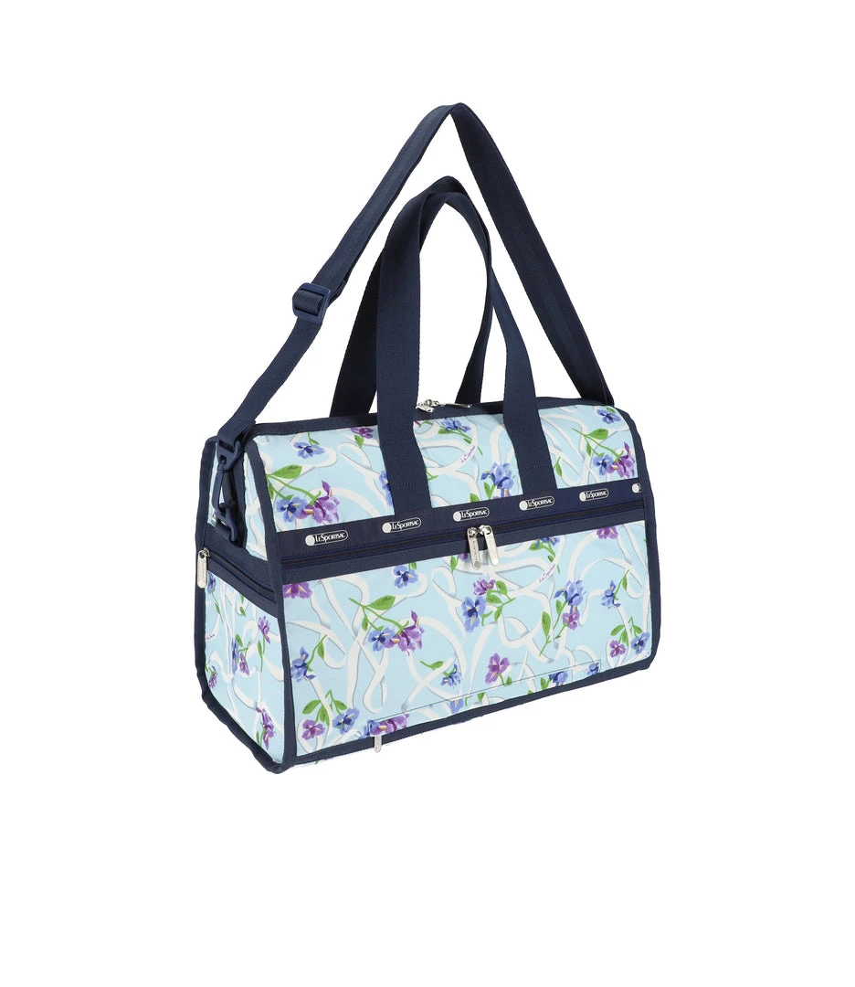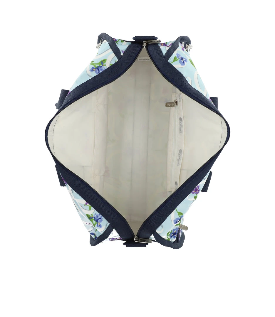 Zip main closure with dual zipper pulls, 7.5in (19.05cm) Top handle drop, 1.5in (3.81cm) Wide adjustable/detachable crossbody strap (Max. 50in/127cm), Exterior front panel zipper pocket, Exterior back panel zip closure pocket with dual zipper pulls and a bottom zipper to convert pocket into a sleeve (to slide over rolling luggage handles), Two exterior side pockets with zip closures, Three interior front wall open pockets, Interior back wall combination zip/open pocket