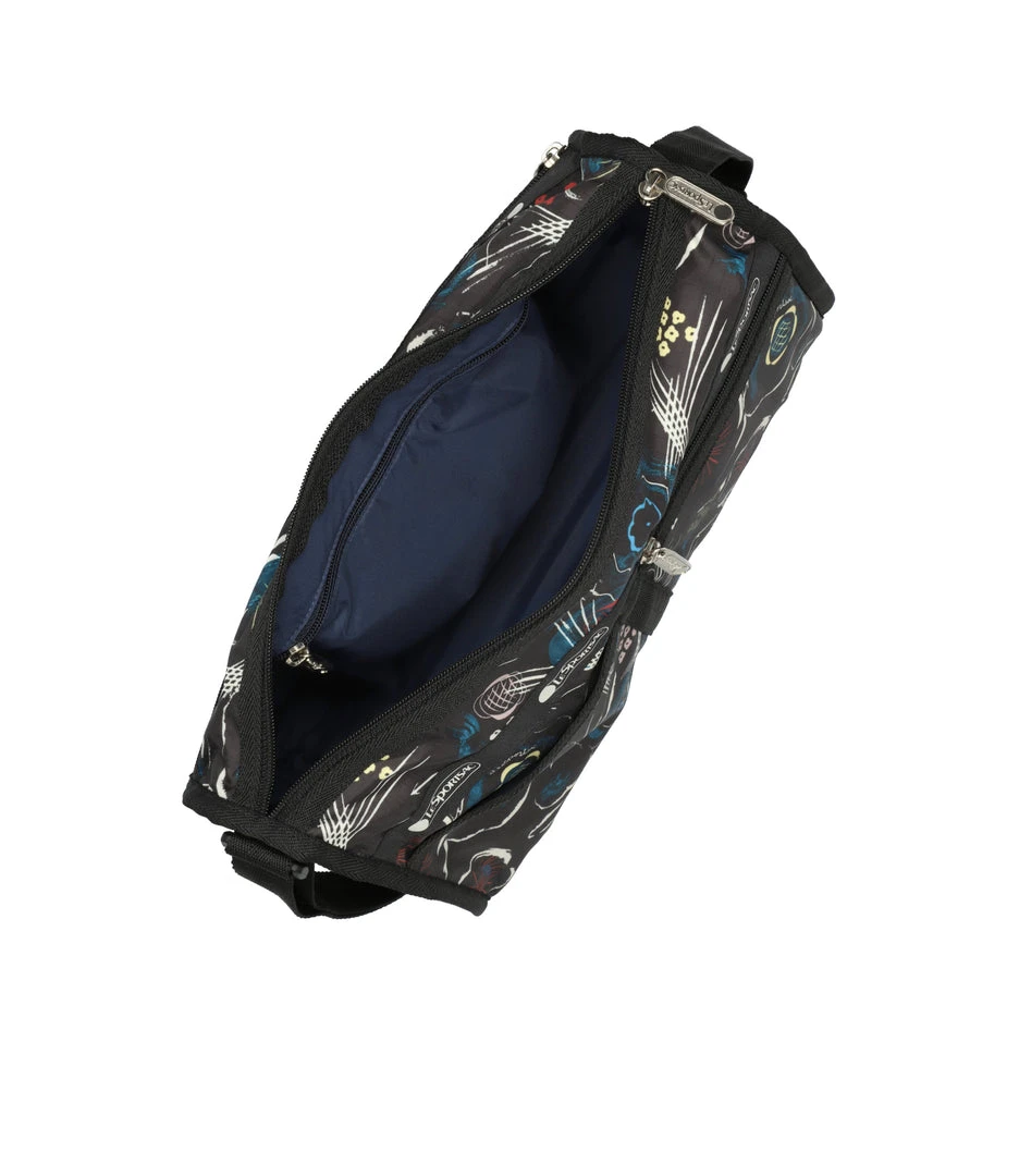 Zipped main closure, Exterior front open pocket, Exterior front pocket with zipped closure, Exterior back pocket with zipped closure, Two exterior open side pockets, Adjustable shoulder strap (Max. 52in/132cm), Interior pocket with zipped closure, Includes matching pouch with zipped closure