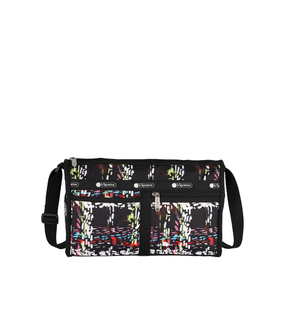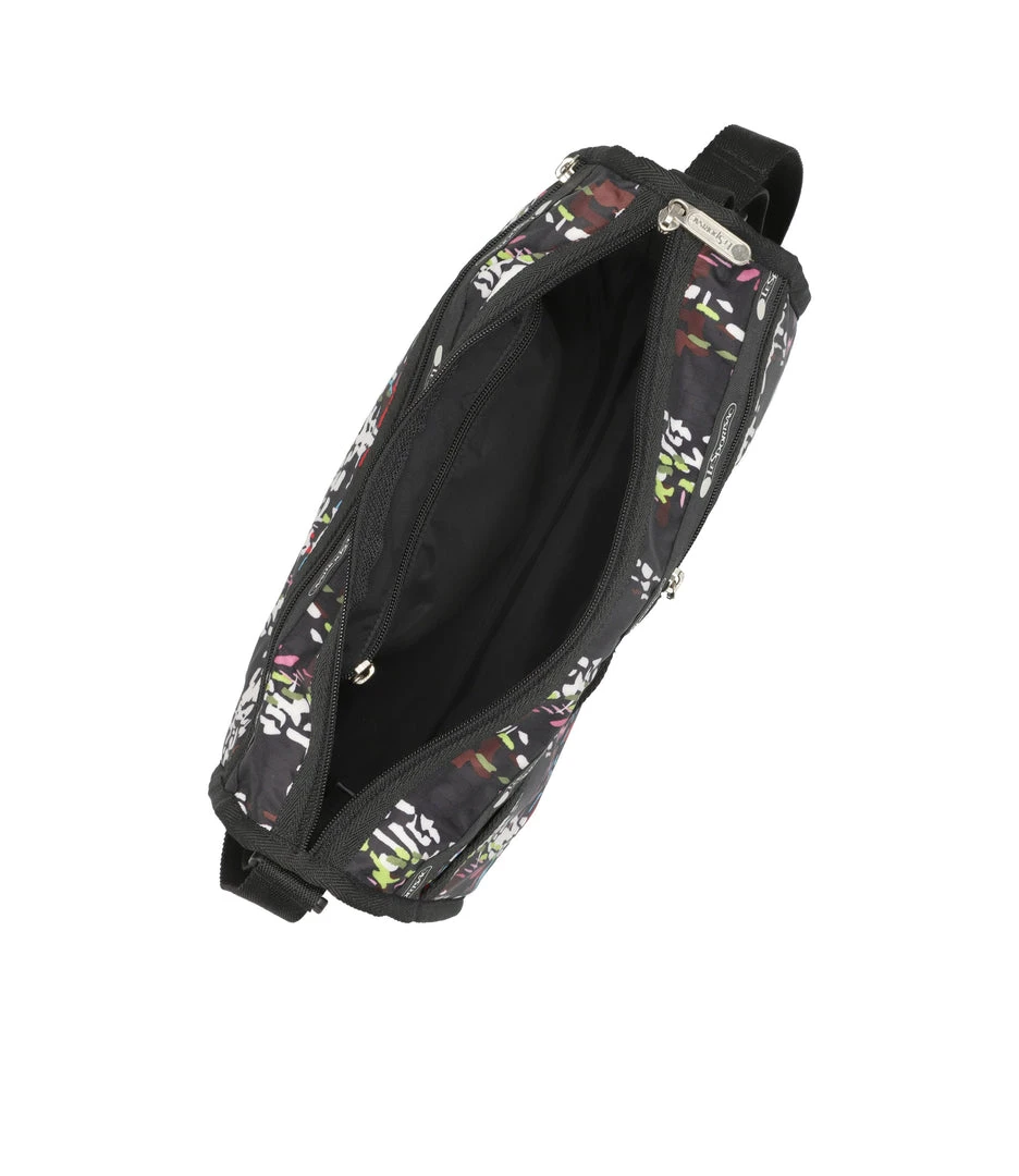 Zipped main closure, Exterior front open pocket, Exterior front pocket with zipped closure, Exterior back pocket with zipped closure, Two exterior open side pockets, Adjustable shoulder strap (Max. 52in/132cm), Interior pocket with zipped closure, Includes matching pouch with zipped closure