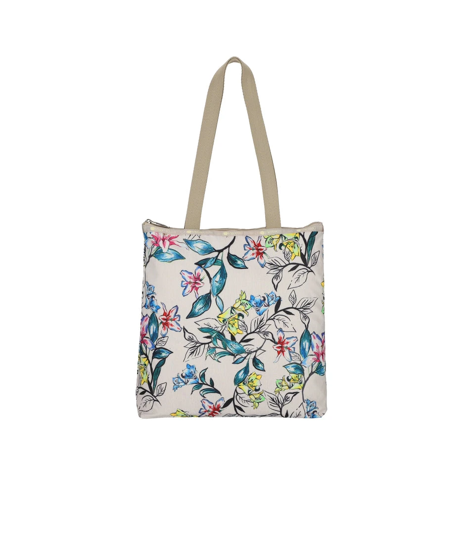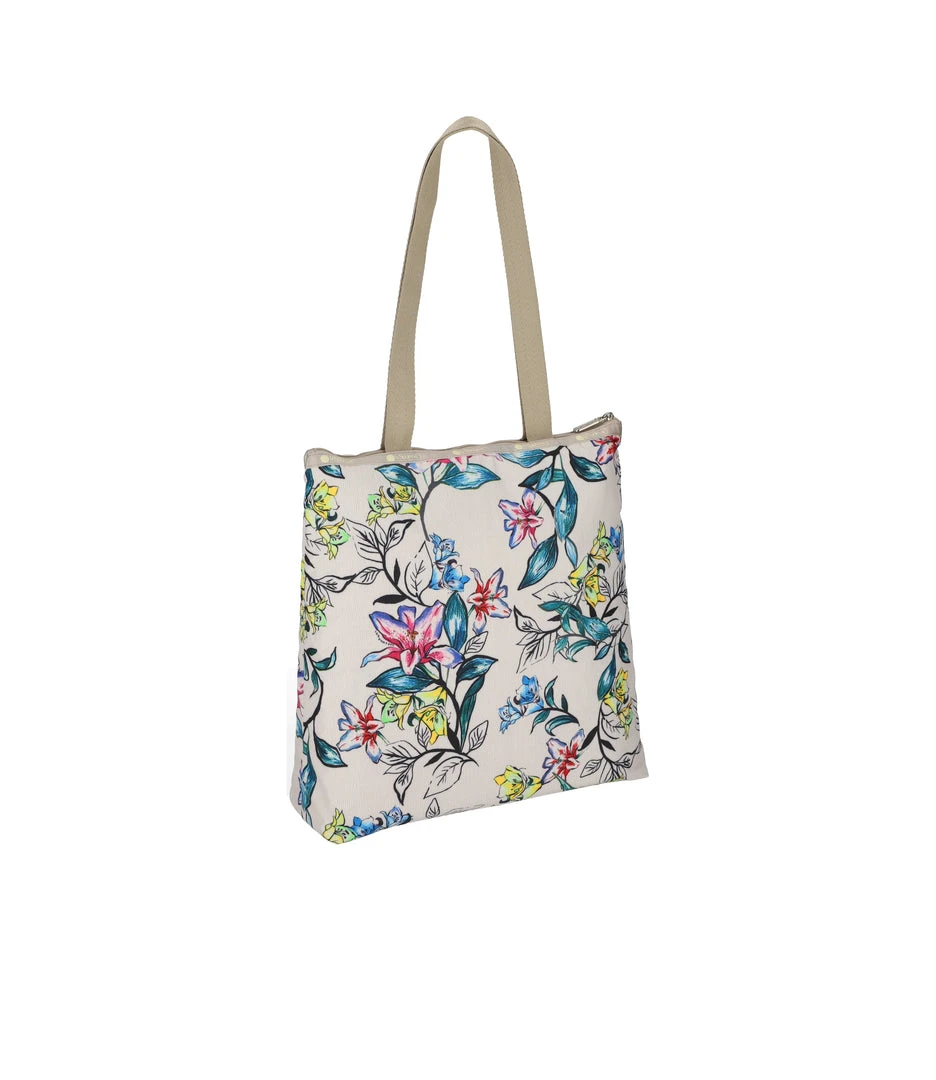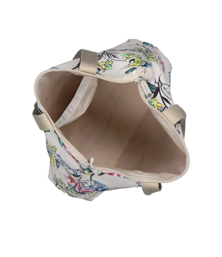Zipped main closure, 1in (2.5cm) wide top handles (Length: 24.6 in/62.5 cm), Interior back wall combination zip/open pocket