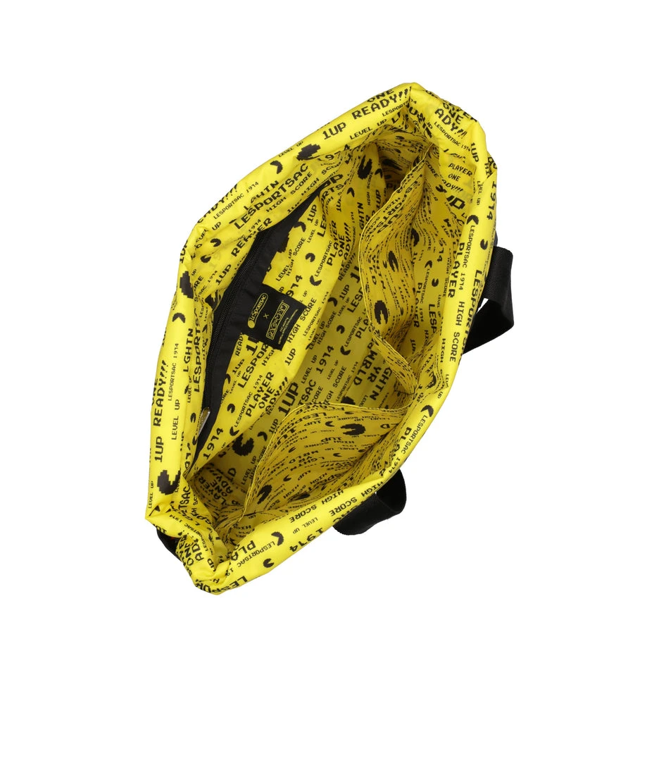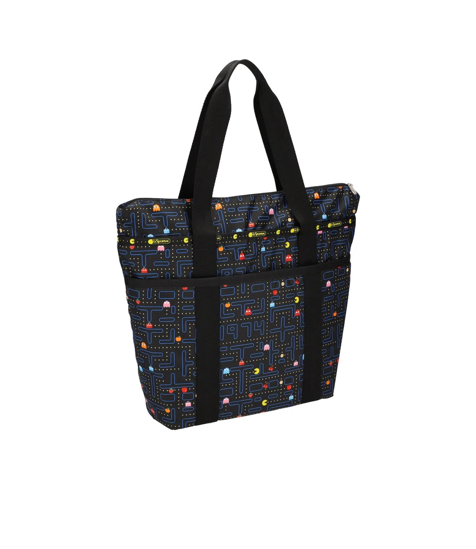 Zip main closure, Top zipper gusset can be expanded upward for extra interior room (which adds 2in/5.1cm of vertical space), Exterior front small open pocket for phone, Exterior back full-length zip pocket, Two interior front wall open pockets, Interior back wall zip pocket, 1.5in/3.8cm wide pinched top handles (Drop: 11in/27.94cm, Length: 26.37in/67 cm)