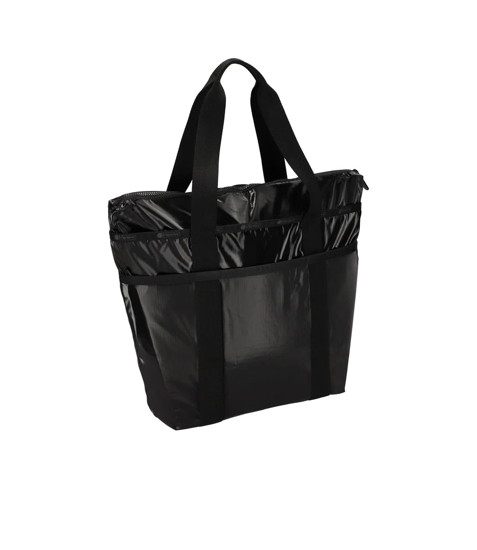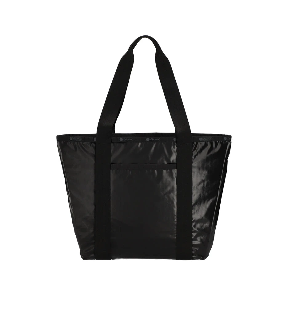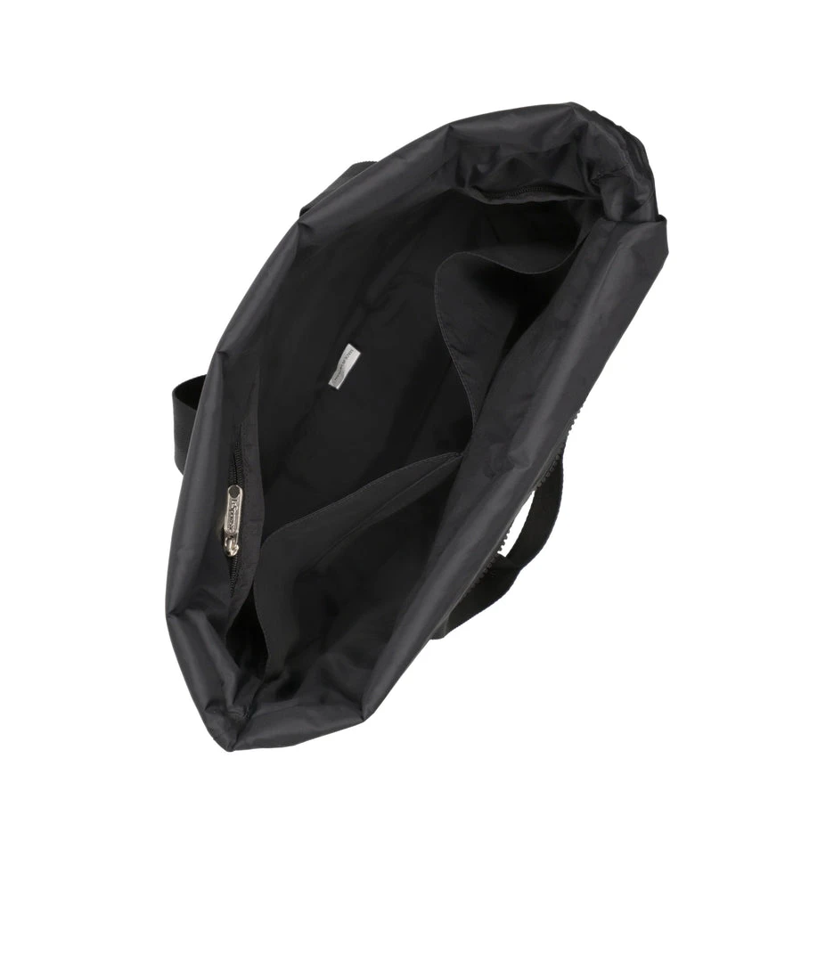Zip main closure, Top zipper gusset can be expanded upward for extra interior room (which adds 2in/5.1cm of vertical space), Exterior front small open pocket for phone, Exterior back full-length zip pocket, Two interior front wall open pockets, Interior back wall zip pocket, 1.5in/3.8cm wide pinched top handles (Drop: 11in/27.94cm, Length: 26.37in/67 cm)