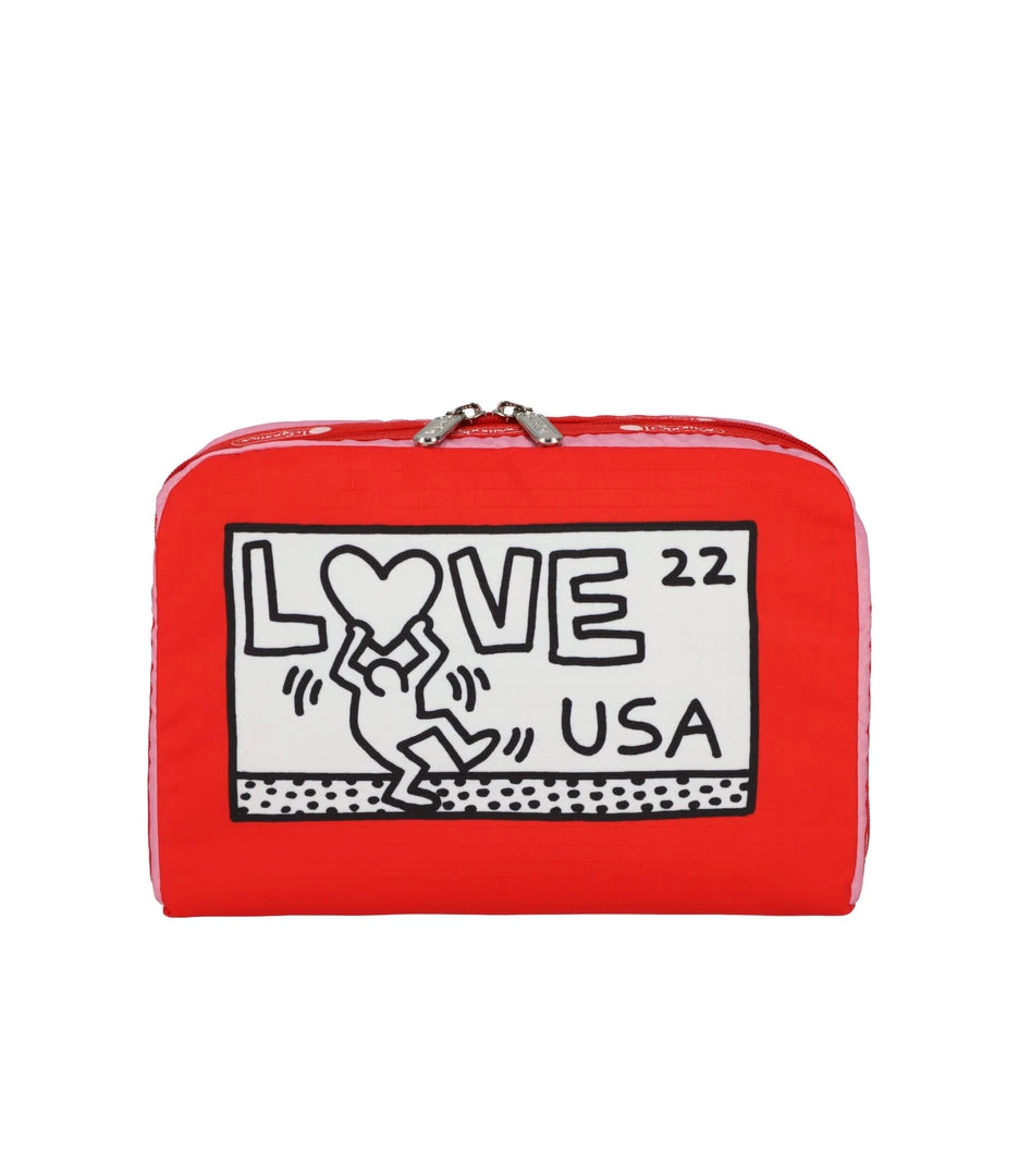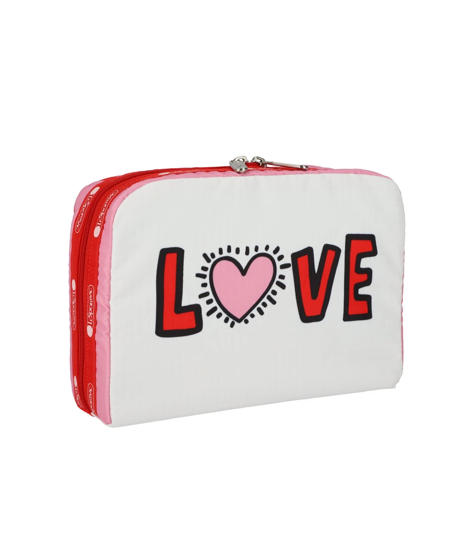 Zip main closure with dual zipper pulls, Interior front wall open pocket, Two interior back wall open pockets
