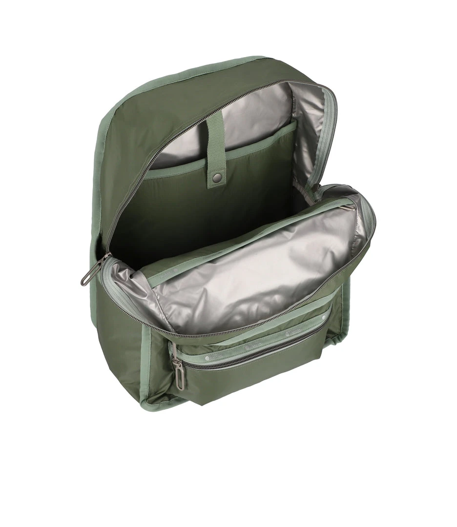 Zip main closure with dual zipper pulls, Adjustable padded shoulder straps, Two exterior front pockets with zip closures, Pinched top loop for hanging, Two exterior side open top pockets for water bottles, Exterior back small zip pocket for phone or wallet, Interior back wall padded laptop pocket with snap closure (fits laptops up to 15in), Interior front wall zip pocket