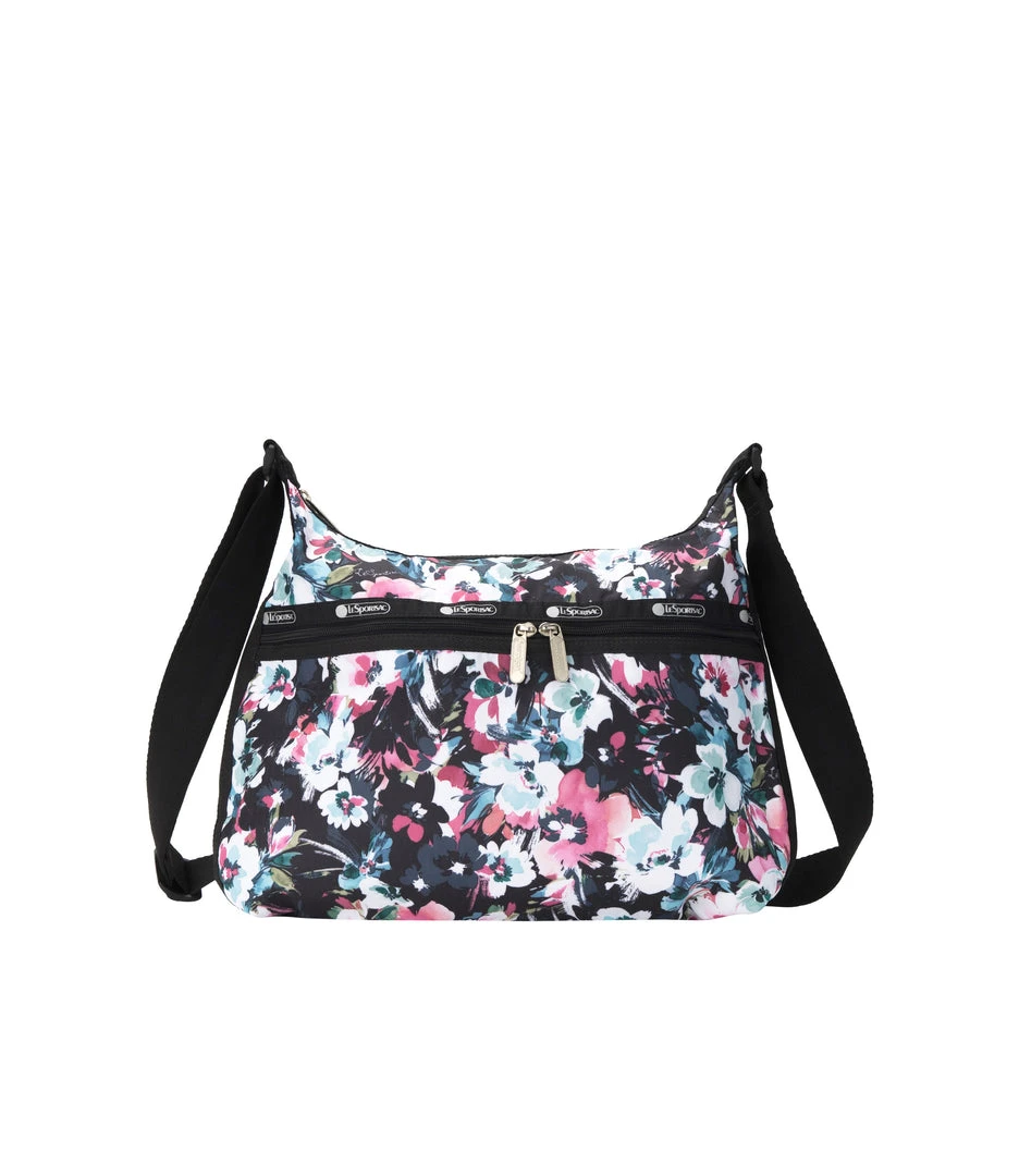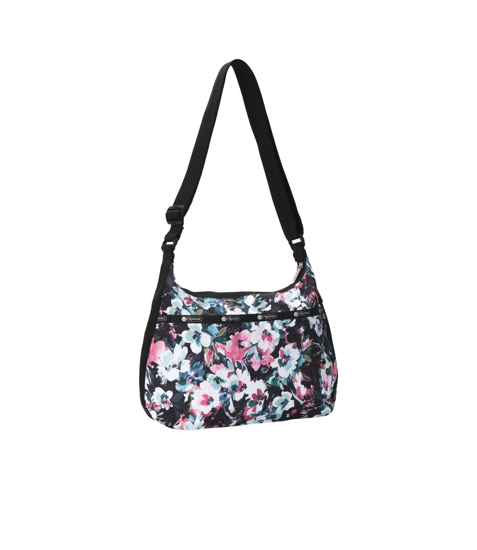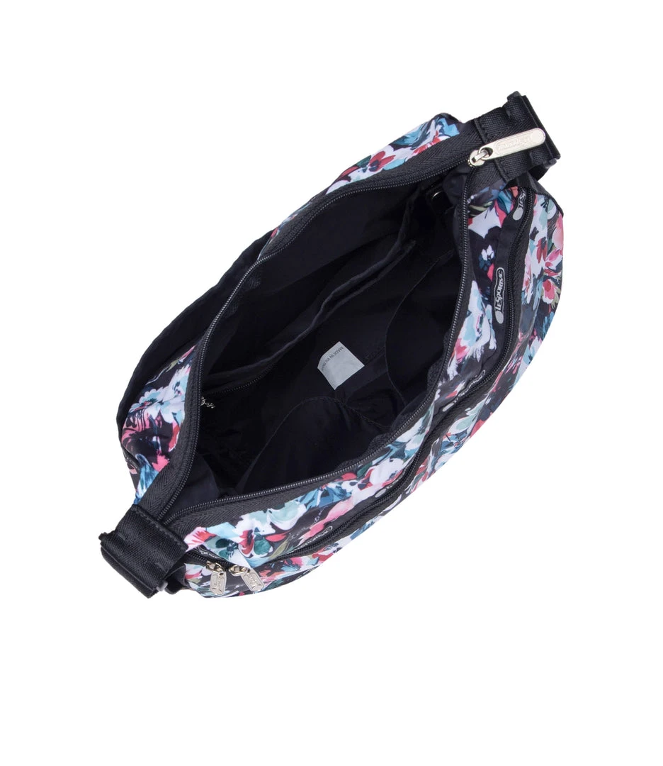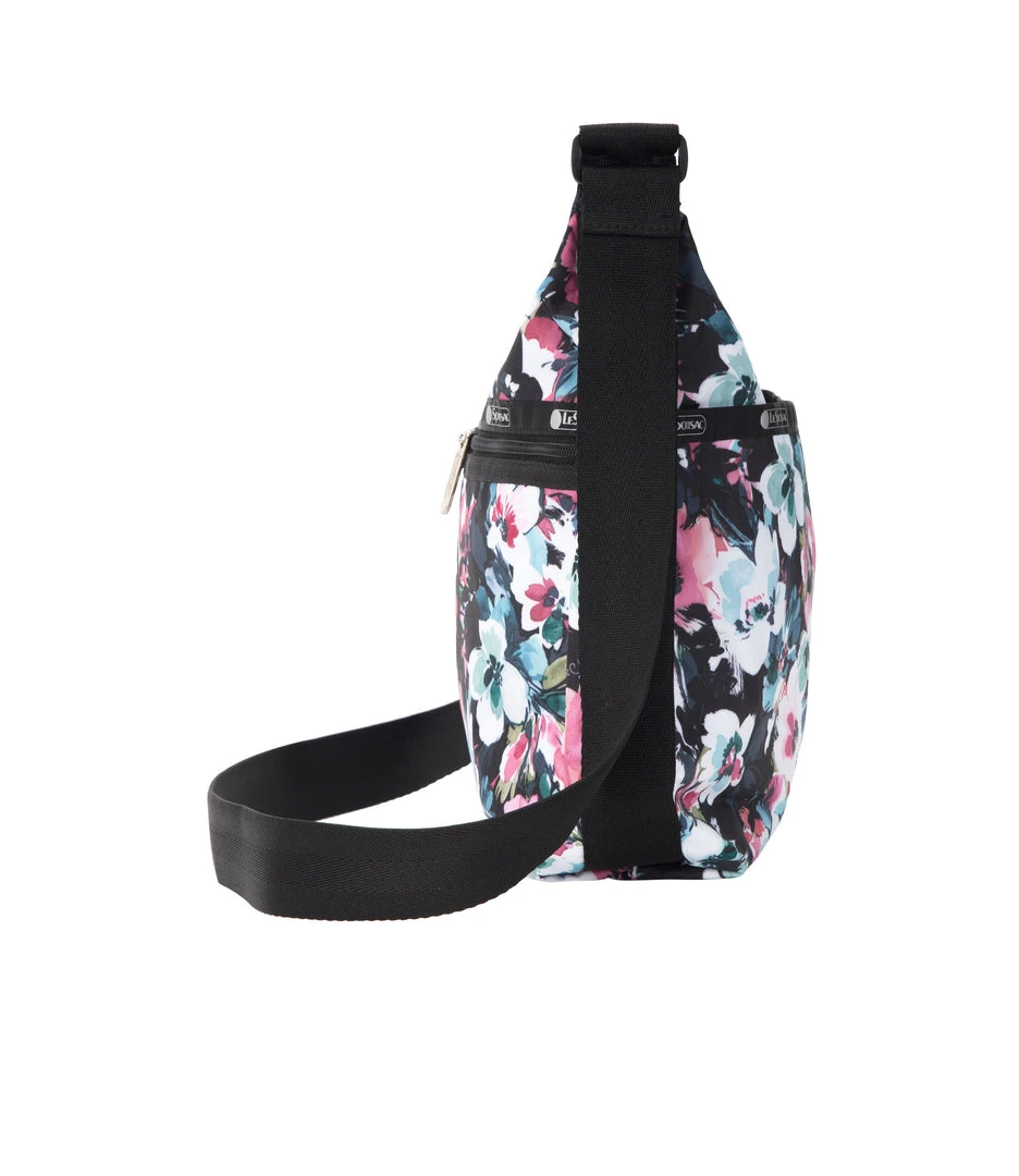 Zip main closure, Exterior front pocket with dual zip closure, Exterior back open pocket with magnetic snap closure, Two interior front wall open pockets, Interior back combination zip/open pocket with key loop on top of large open pocket, 1.5 in/3.8cm wide adjustable shoulder strap (Max length: 26.2 in/66.5 cm, Min length: 16.7 in/ 42.5 cm)
