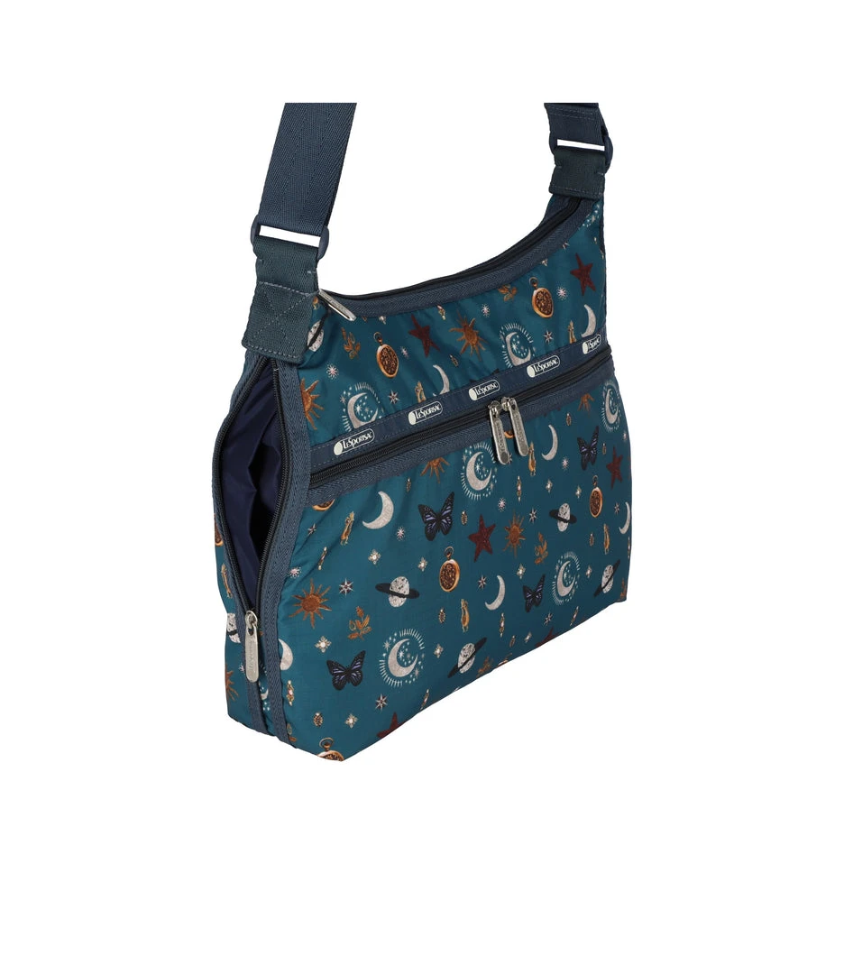 Zip main closure, Exterior front pocket with dual zip closure, Exterior back open pocket with magnetic snap closure, Two interior front wall open pockets, Interior back combination zip/open pocket with key loop on top of large open pocket, 1.5 in/3.8cm wide adjustable shoulder strap (Max length: 26.2 in/66.5 cm, Min length: 16.7 in/ 42.5 cm)10.2H x 12.6W x 3D in, 26H x 32W x 7.5D cm