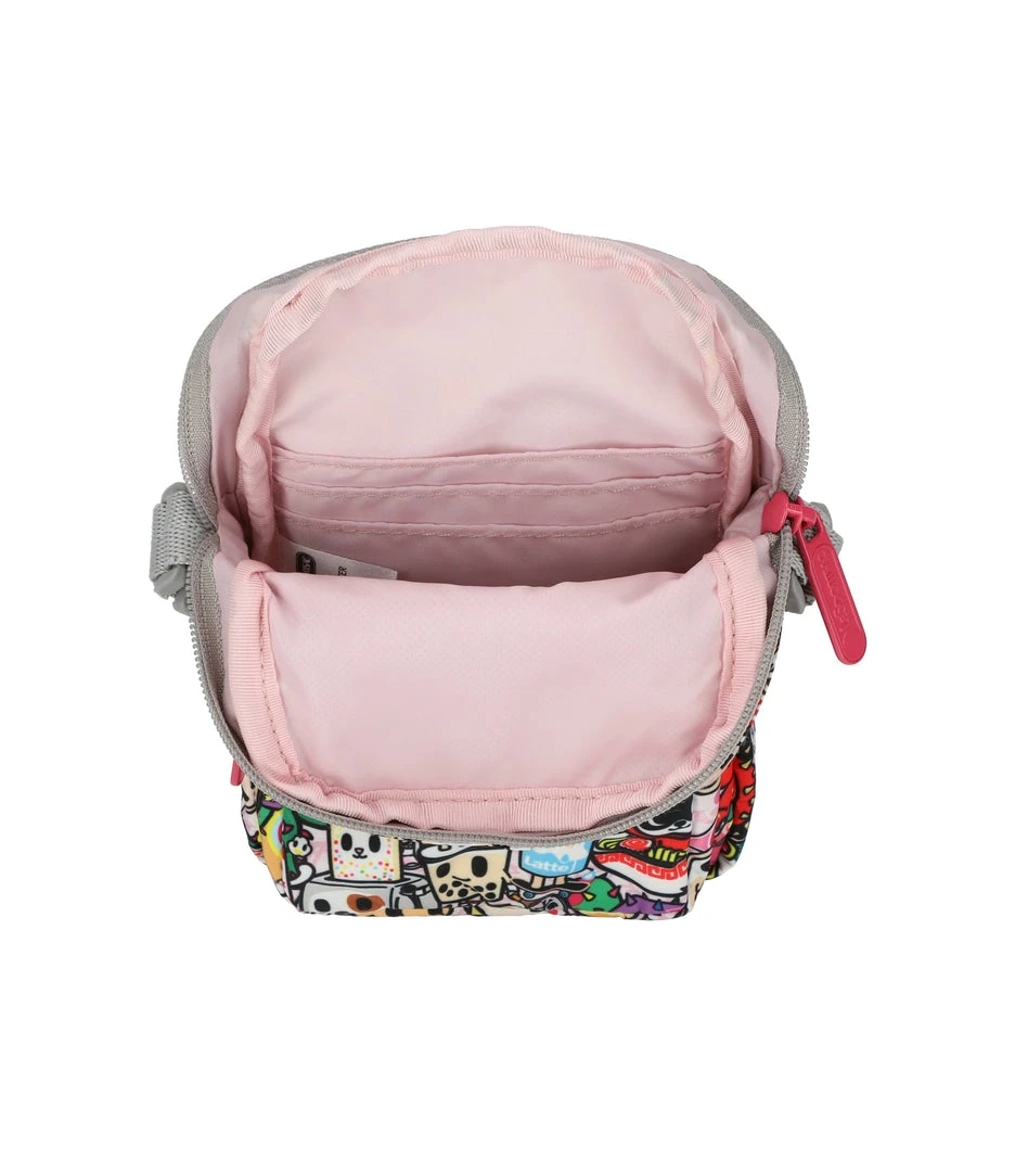 Zip top main closure, Exterior front pocket with zip closure, Exterior back open pocket, Interior back wall features an open pocket and two card pockets, Adjustable/non-detachable crossbody strap (Min Length: 26.5in/67.3cm and Max Length: 51in/132.1) with plastic hardware, Includes a detachable woven plush Palette head charm on 1in (2.5cm) long gold-tone metal chain with ring clip