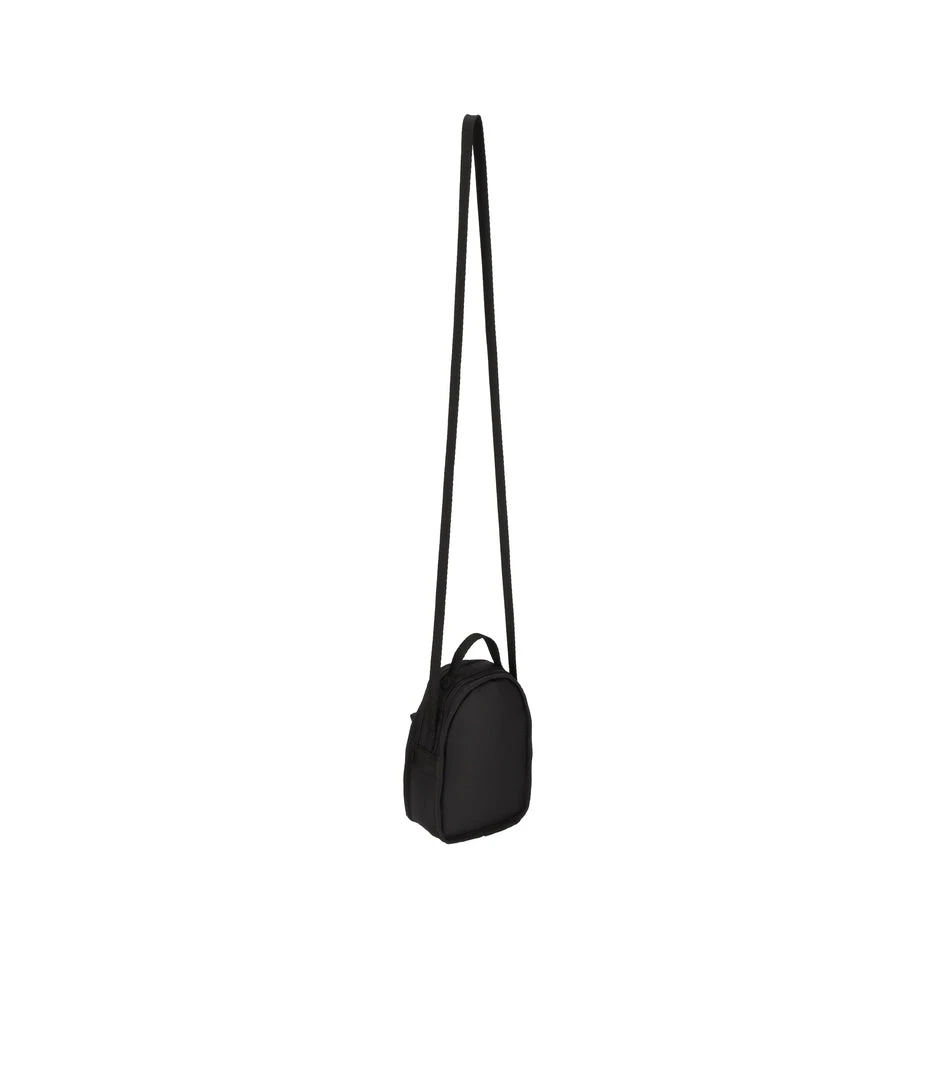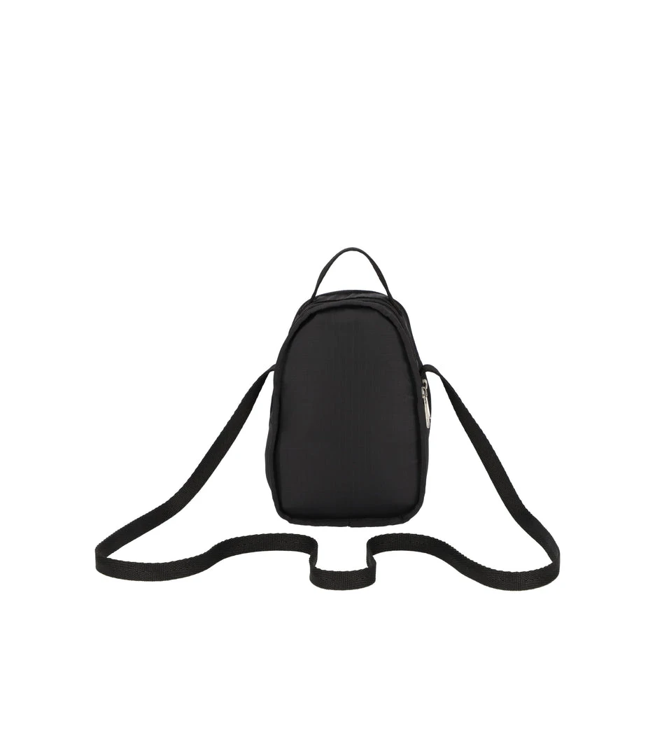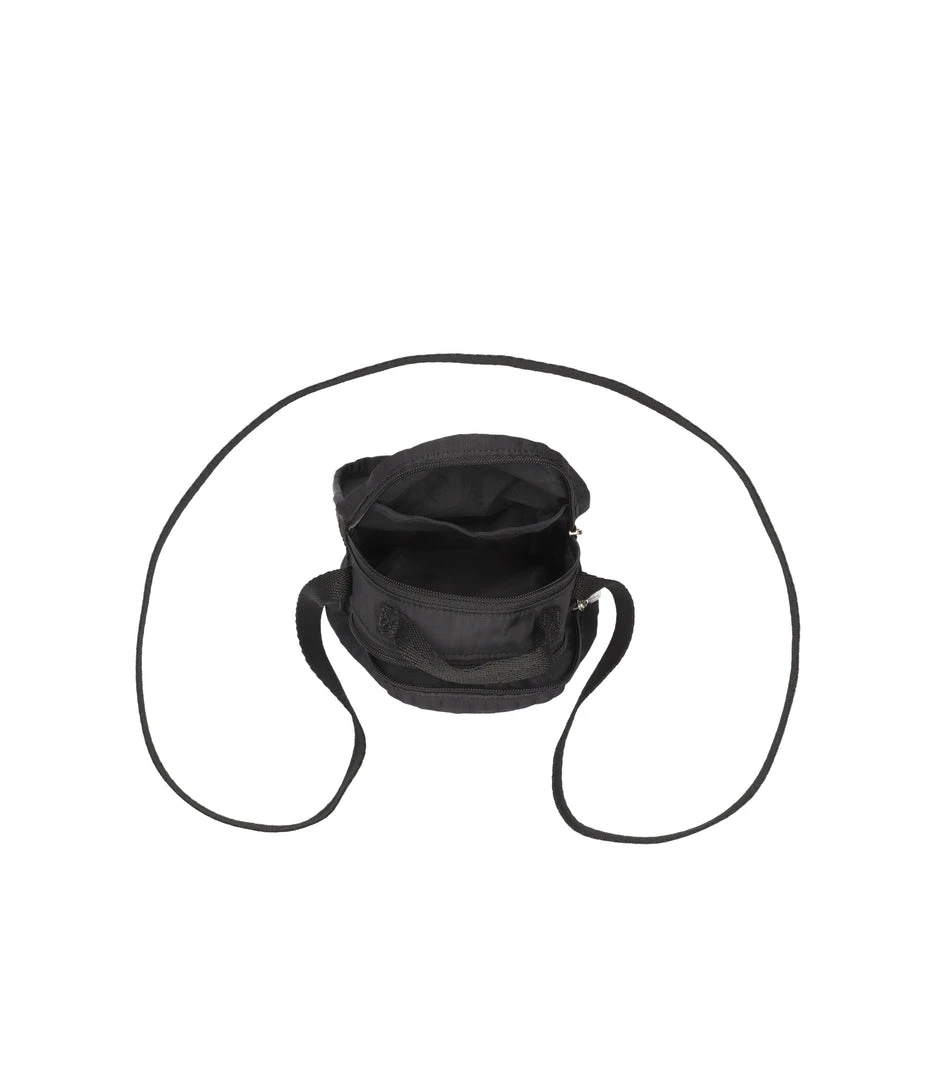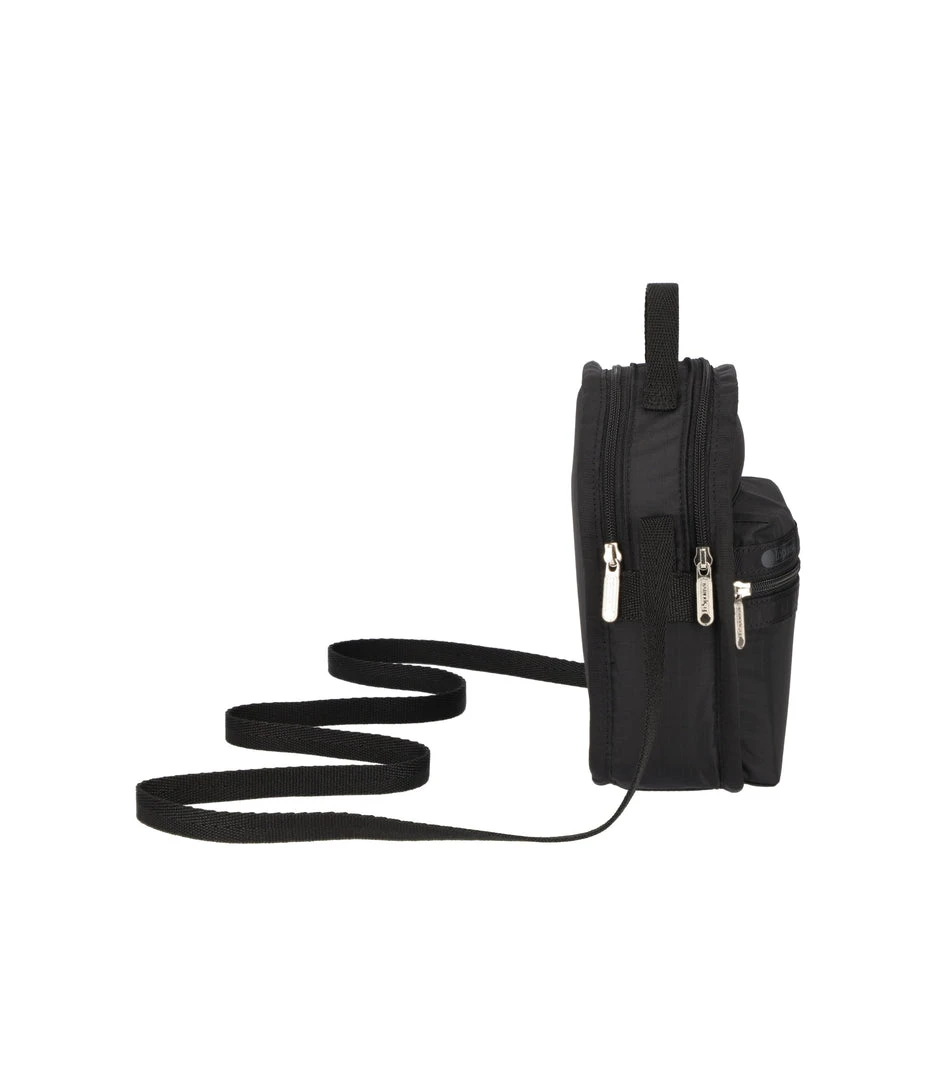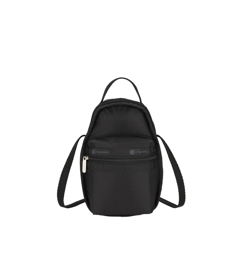Features two compartments with zip closures: a larger front compartment and a smaller rear compartment with an interior back wall open pocket, Exterior front zip closure pocket, Top loop handle (Width: 0.5in/1.27cm, Drop: 1.2 in/3 cm, Length: 5.5 in/14 cm), Non-adjustable webbing shoulder/crossbody strap (Width: 0.5in/1.27cm, Length: 50 inch /127 cm)