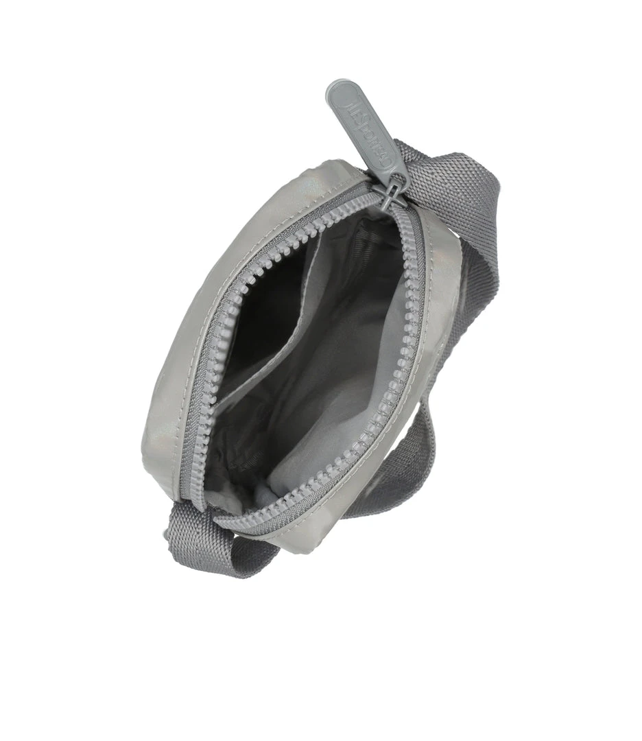 Coastal Chroma Patent is silvery gray patent fabric with a rainbow holographic effect.