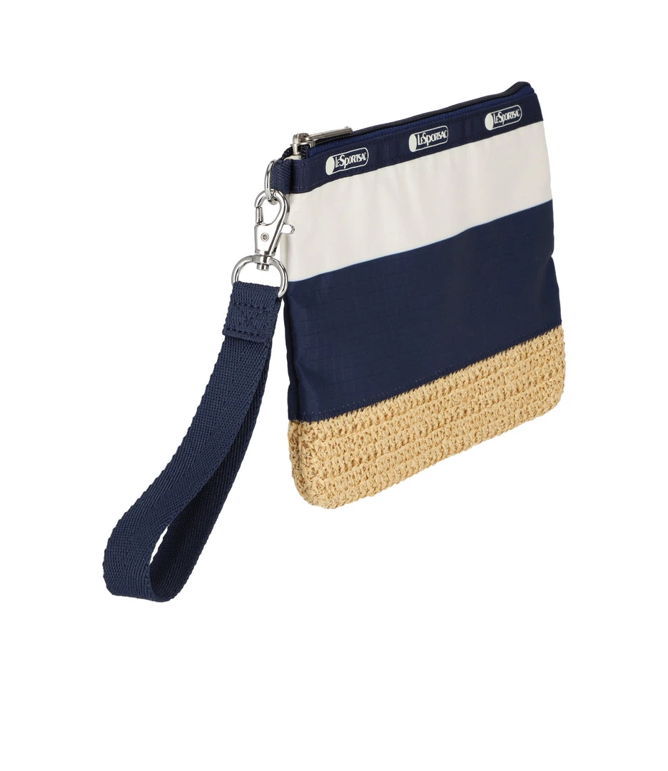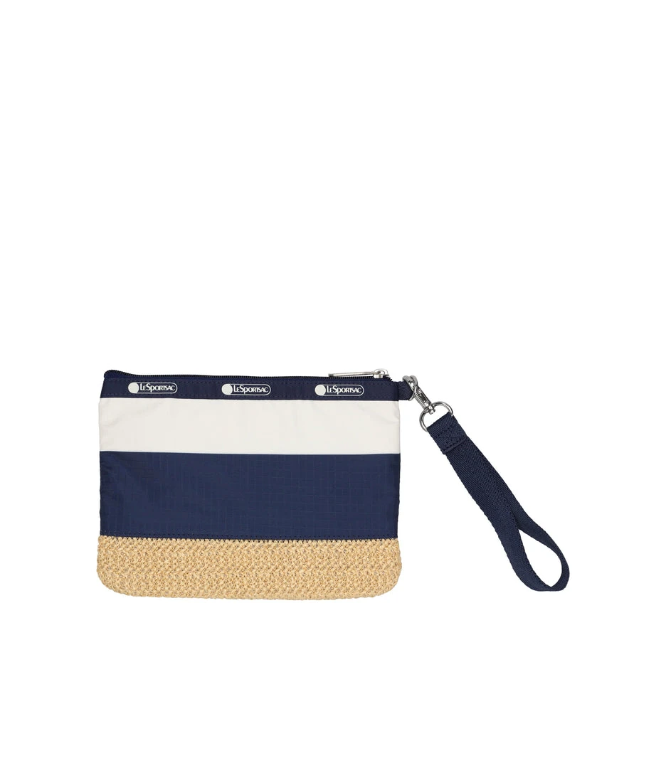 Zip main closure, Interior back wall open pocket, Loop and D ring on exterior left side with a 0.75in/1.9cm wide detachable wristlet strap(Length: 5.8 in/14.8 cm)