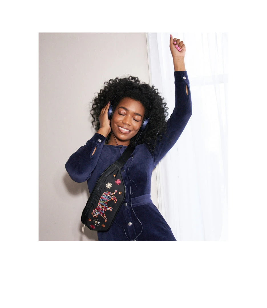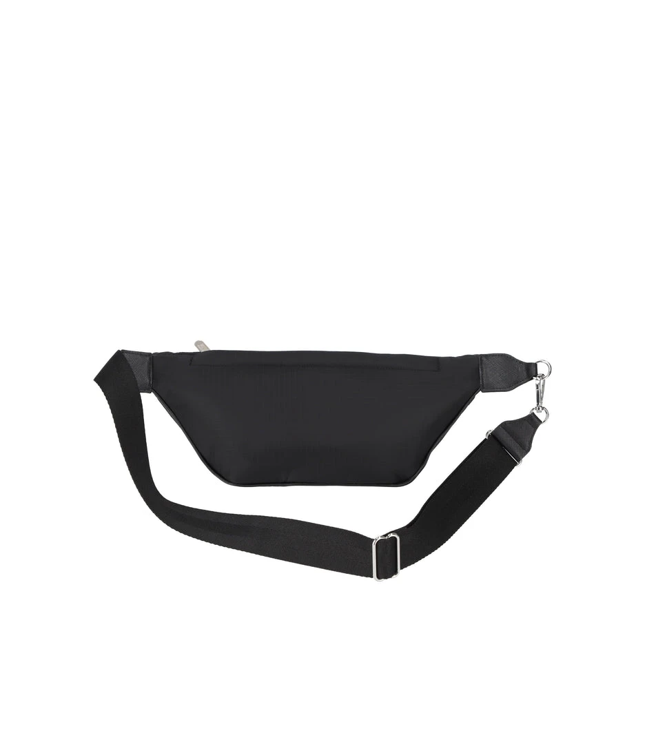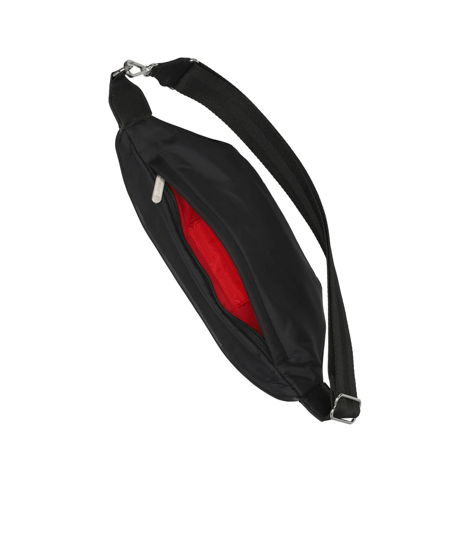 Zip closure front main compartment, Exterior back top zip closure pocket with 3 credit card slots on interior back wall, 1.5in/3.8cm wide adjustable waist belt with a minimum length of 36 in/91.5 cm and maximum length of 50.75in/129 cm (measurements include length of bag body and clip), Features metal hardware and vegan-leather trim details