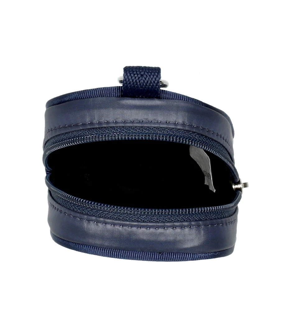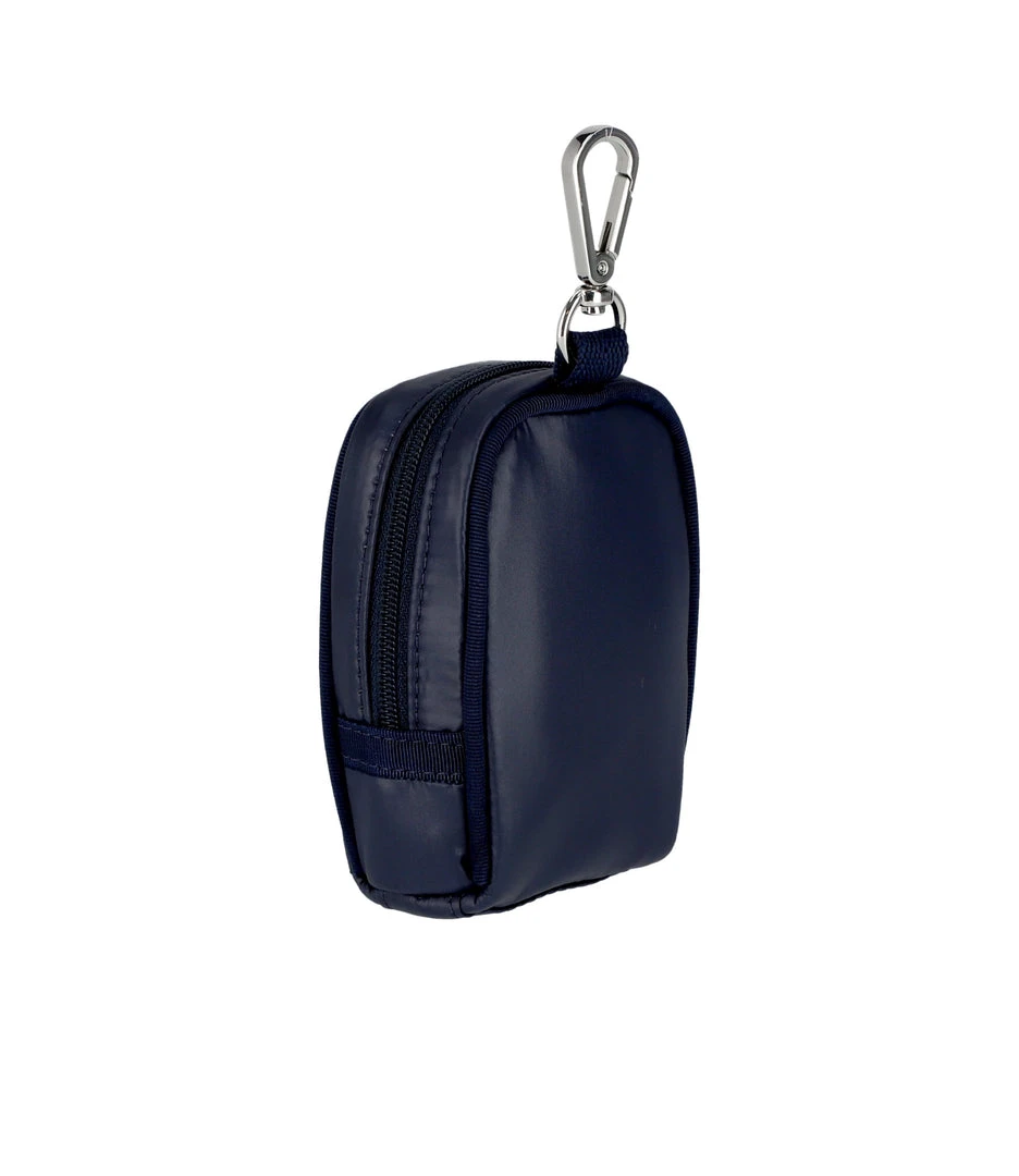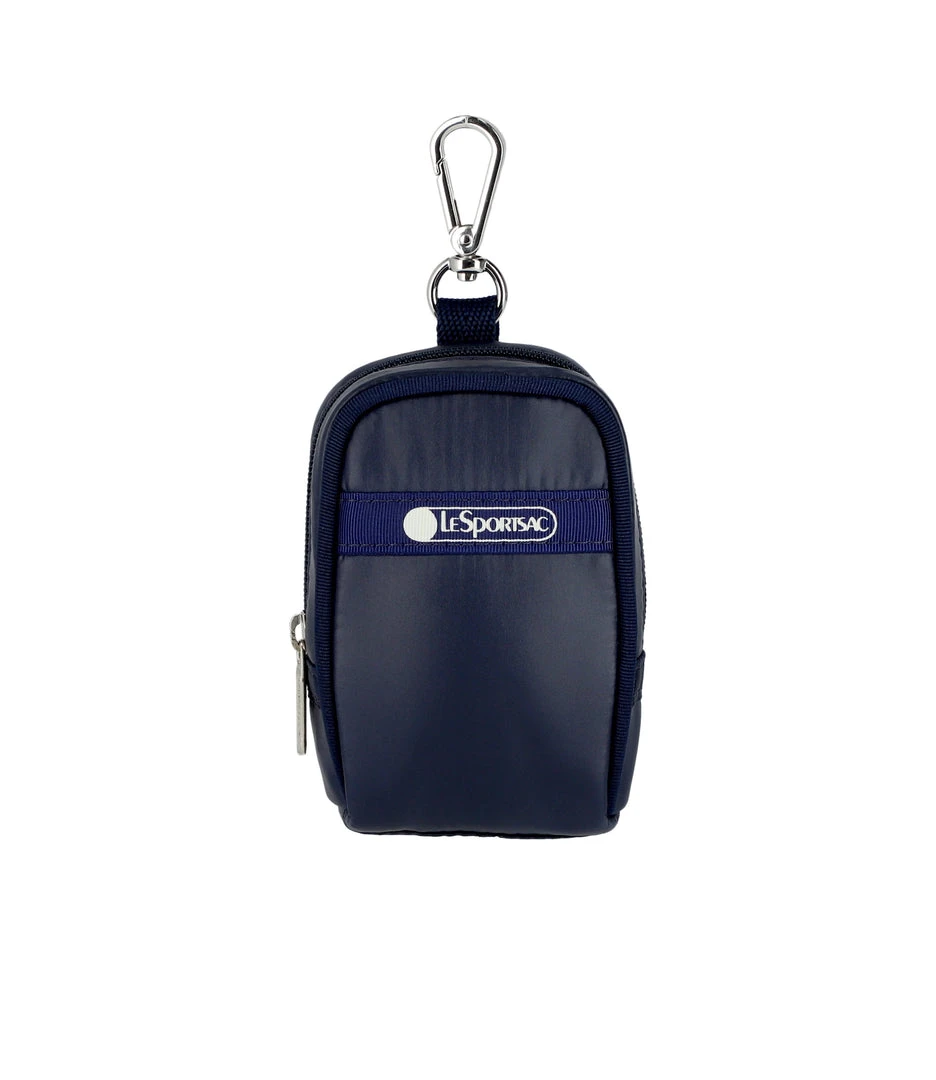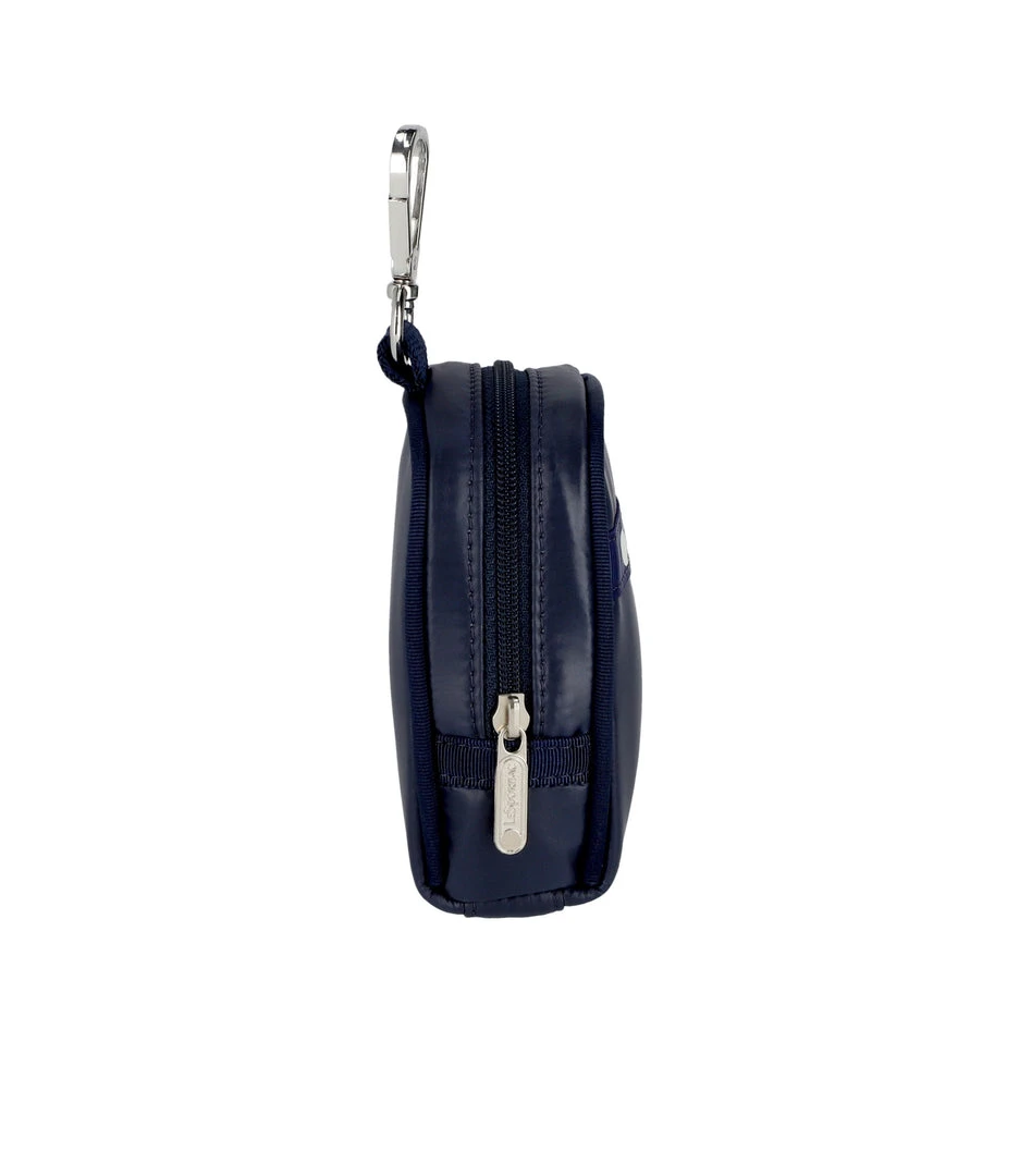 Small zip closure pouch with top metal clip (to attach on your bag or key ring). Fits a variety of small items such as: wireless earbuds, lip balm, travel sized hand sanitizer, and coins.