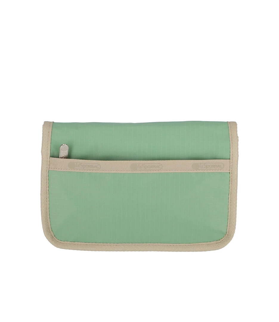 Exterior front zip pocket, Magnetic snap closure under flap, Exterior back pocket with hidden magnetic snap closure, 0.5 in/1.27cm wide snap-off detachable crossbody strap (Max length 50in/127cm), Two interior compartments with zip closures, the rear interior zip compartment has a back wall open pocket