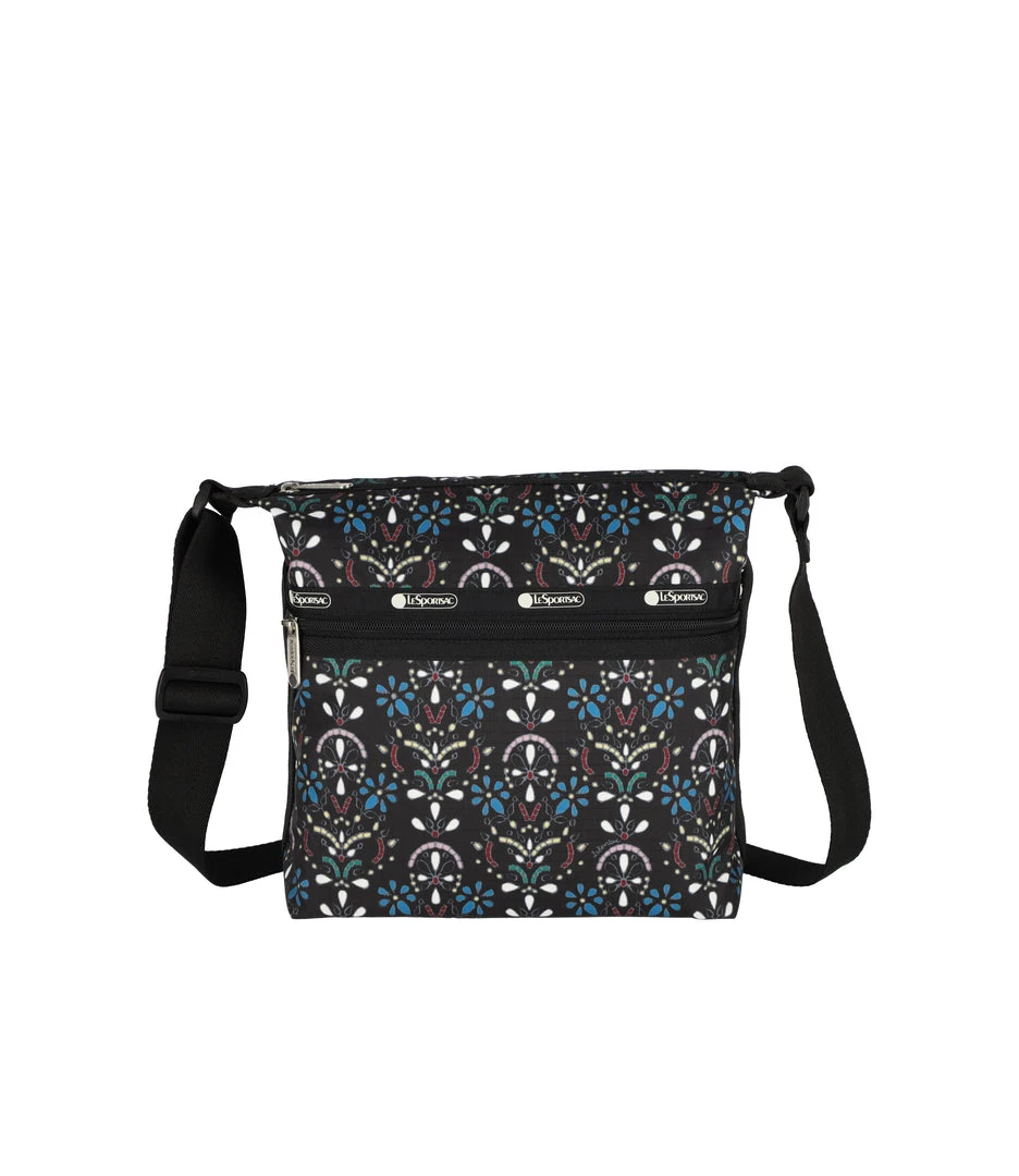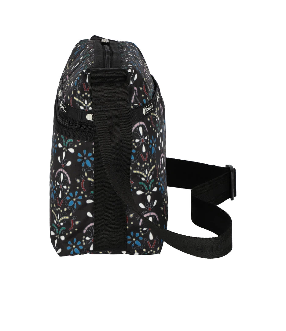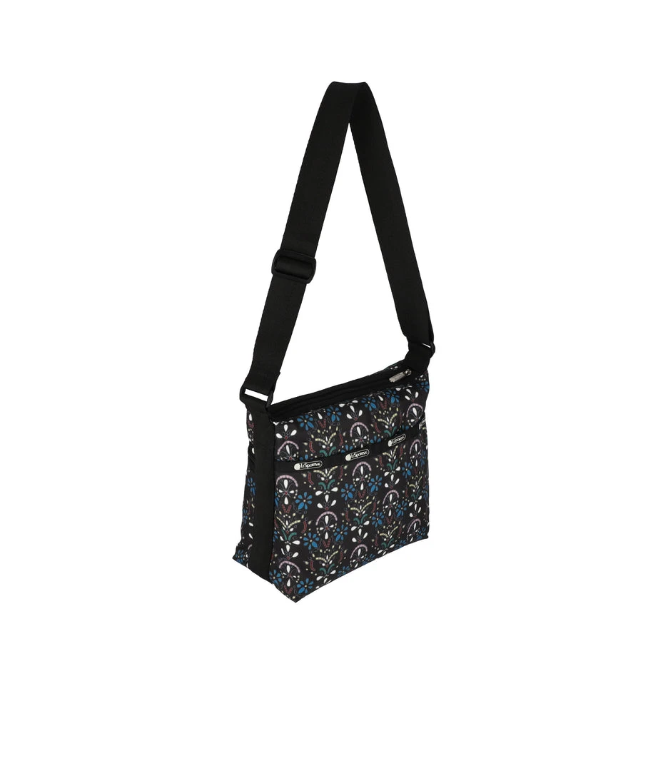 Zip main closure, Exterior front pocket with zip closure, Exterior back open pocket with magnetic snap closure, Two Interior front wall open pockets, Interior back wall features a combination zip/open pocket and a larger open pocket, 1.5 in/3.8cm wide adjustable shoulder strap (Max length: 53 in/134.5 cm, Min length: 30.3 in/ 77 cm)9.25H x 9.25W x 4.5D in, 23.5H x 23.5W x 11.5D cm