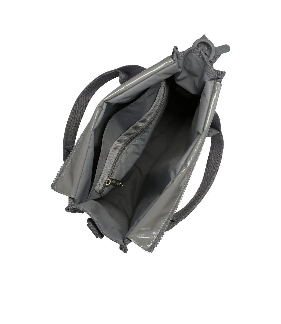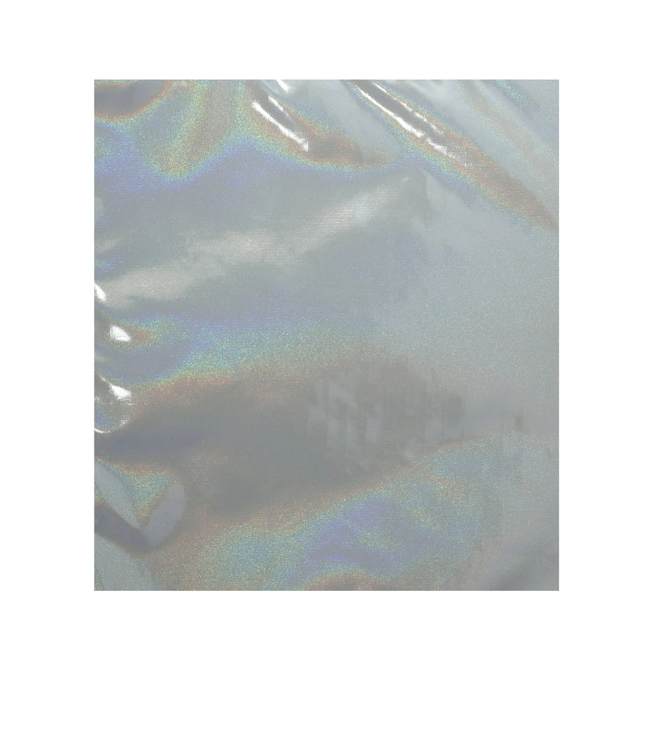Coastal Chroma Patent is silvery gray patent fabric with a rainbow holographic effect.