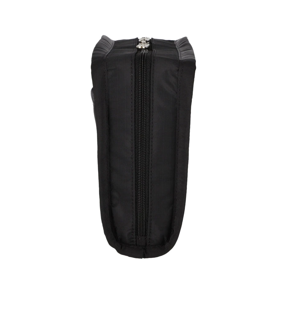 Zip main closure with dual zipper pulls, Exterior front zip pocket, Interior center zip pocket, Four interior open pockets