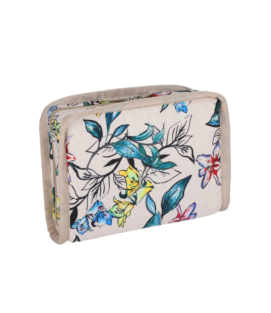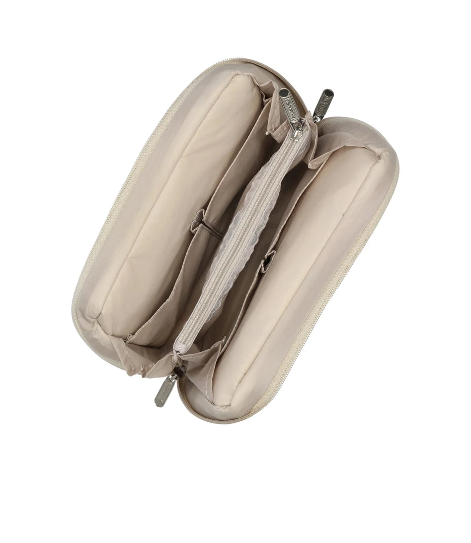 Zip around main closure with dual zipper pulls, Exterior front zip pocket, Interior center zip pocket, Four interior open pockets
