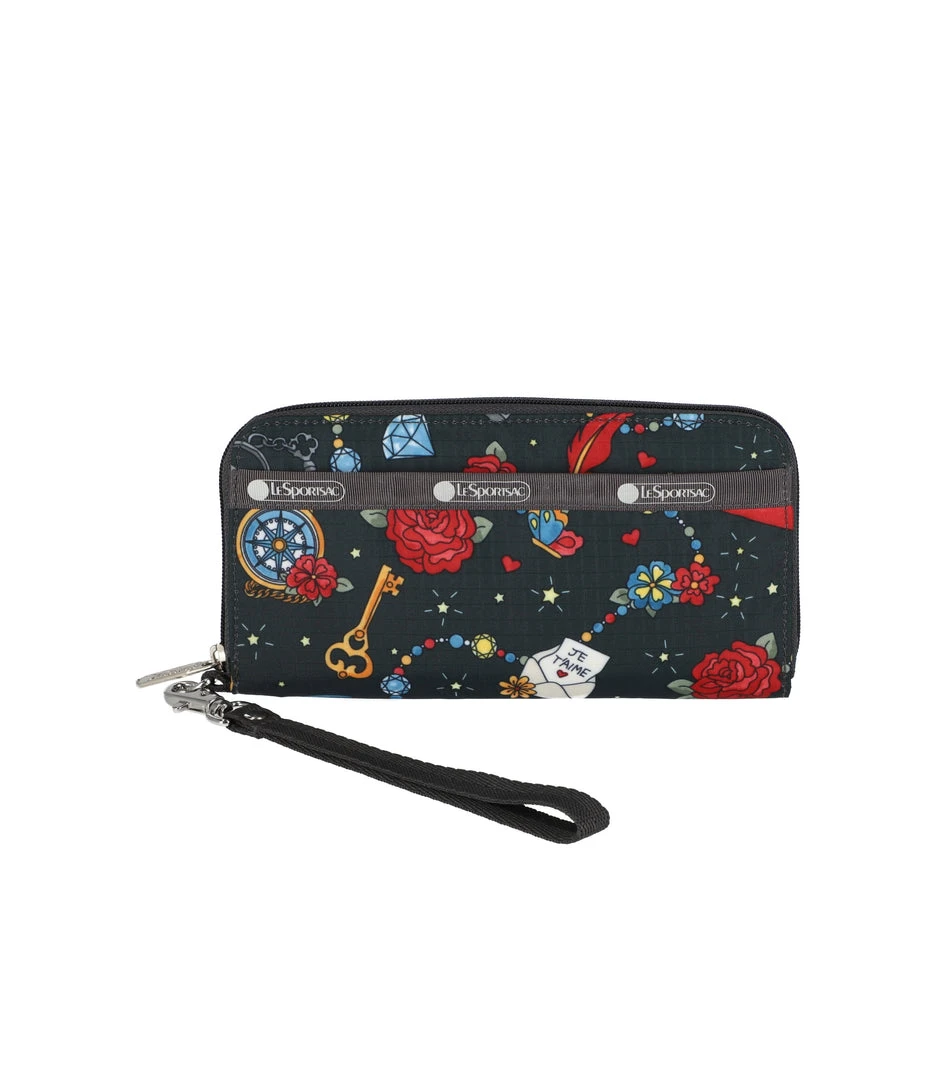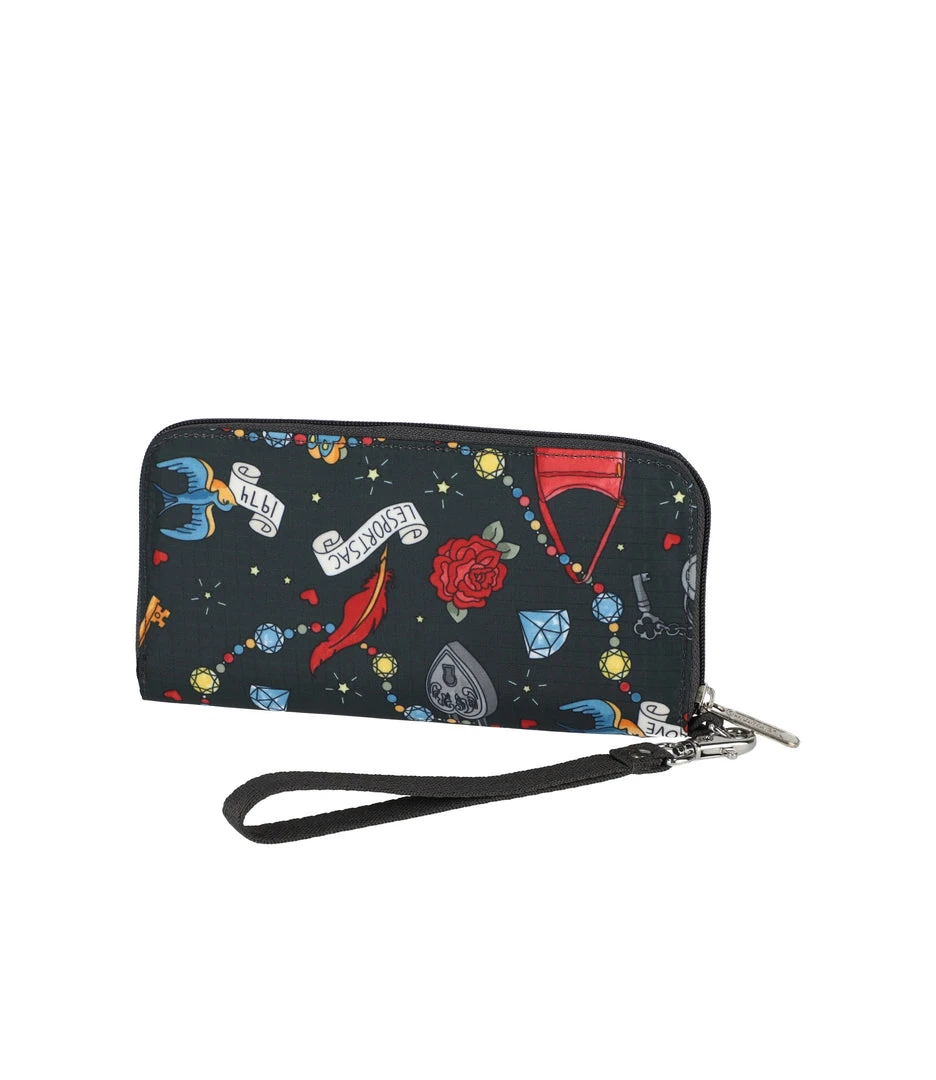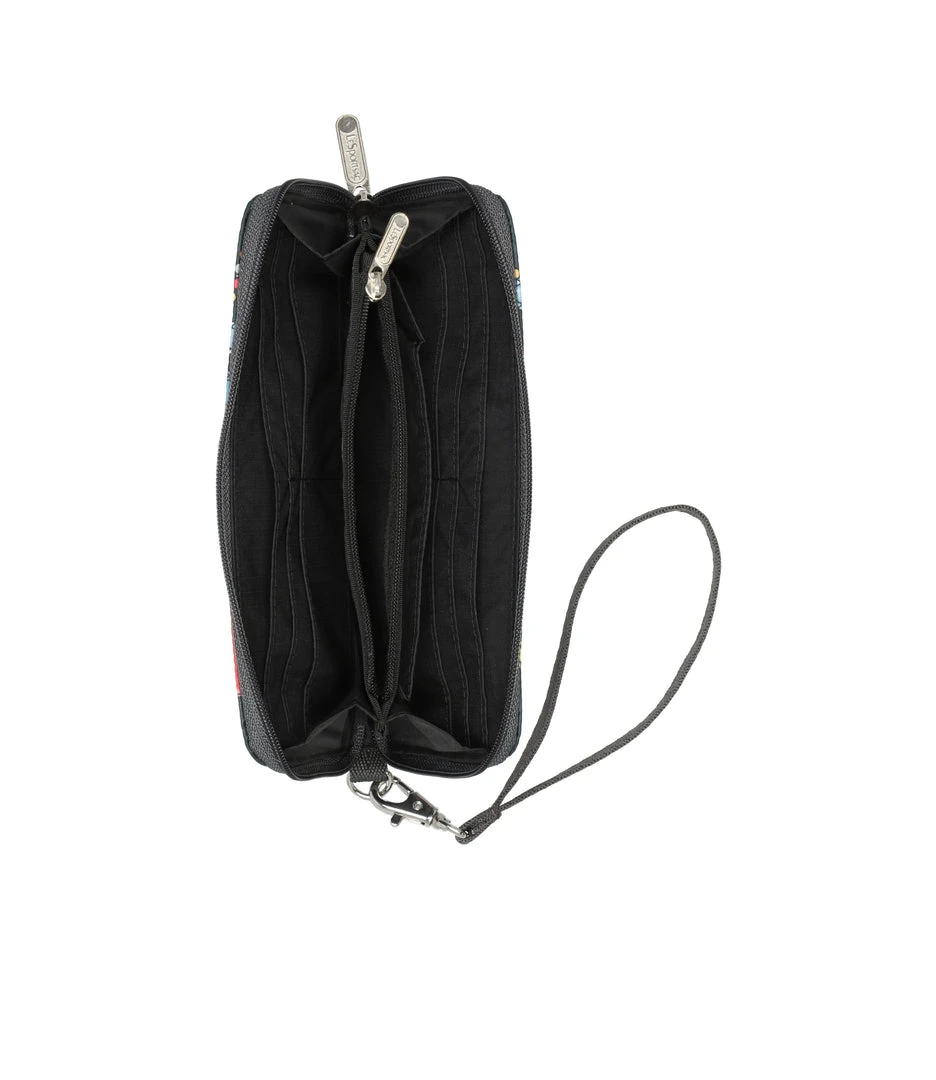 Zip around main closure, Exterior front open pocket, Detachable wristlet strap (0.5in/1.3cm wide webbing strap with a total loop length of 6.5 in/16.5 cm from end to end), Interior features eight total card slots and two full-length bill pockets, Interior center zip closure pocket for coins, Interior open cell phone pocket, Two Interior gusset pockets (to hold receipts, pens or additional paper currency)3.9HÂ x 7.9W x 0.8D in, 10H x 20W x 2D cm