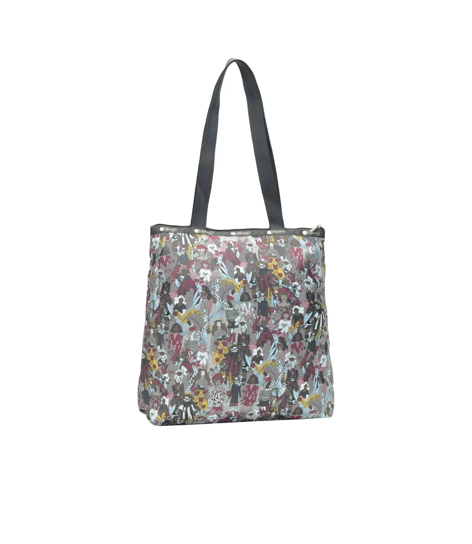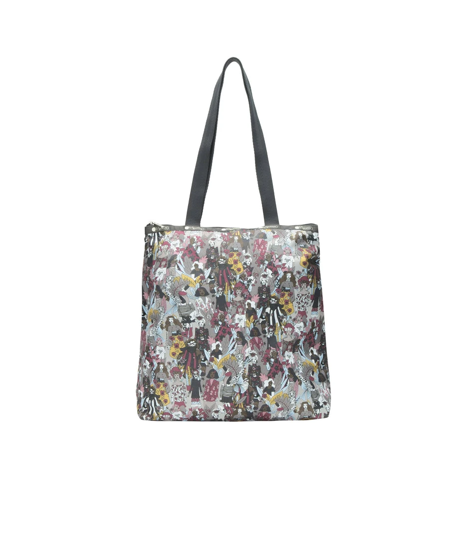 Zipped main closure, 1in (2.5cm) wide top handles (Length: 24.6 in/62.5 cm), Interior back wall combination zip/open pocket
