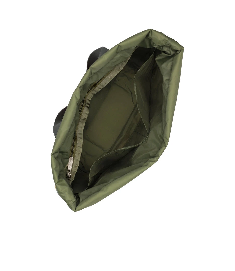 Zip main closure, Top zipper gusset can be expanded upward for extra interior room (which adds 2in/5.1cm of vertical space), Exterior front small open pocket for phone, Exterior back full-length zip pocket, Two interior front wall open pockets, Interior back wall zip pocket, 1.5in/3.8cm wide pinched top handles (Drop: 11in/27.94cm, Length: 26.37in/67 cm)