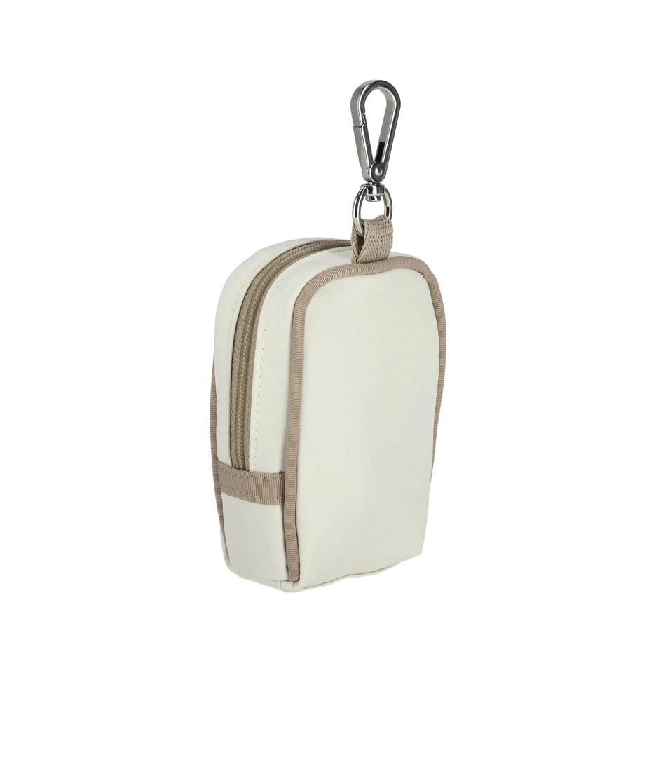 Small zip closure pouch with top metal clip (to attach on your bag or key ring). Fits a variety of small items such as: wireless earbuds, lip balm, travel sized hand sanitizer, and coins.